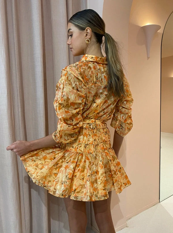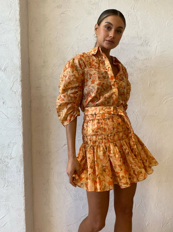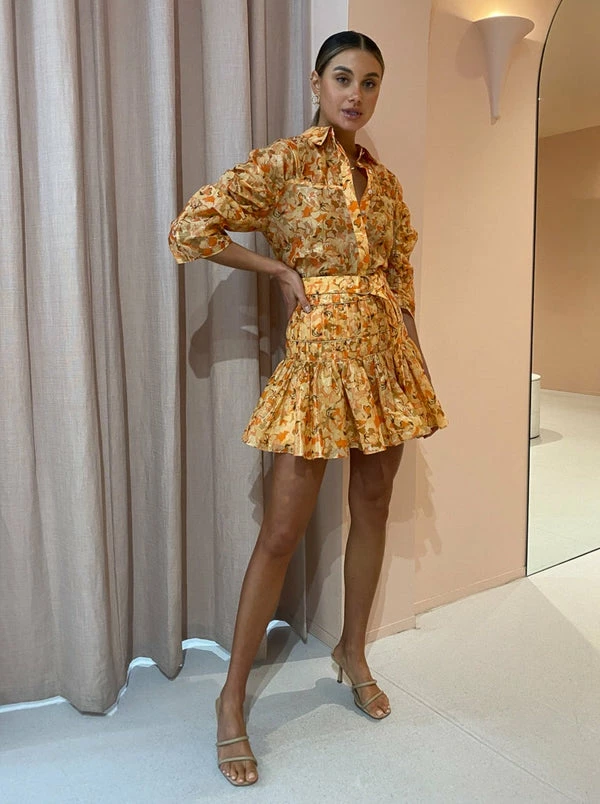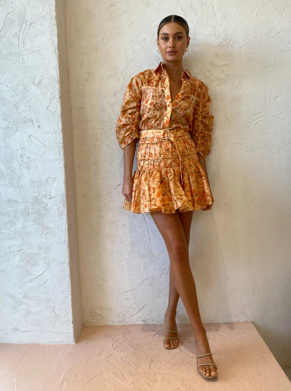 Acler's Bicknell Skirt in Peach Parfait will sweeten your days with colour and feminine charm. Sitting high on the waist, this mini skirt is crafted from a luxurious Cotton Metallic blend in a romantic abstract print. Flattering the waist with pleat detailing with a textured finish, this fitted waist skirt leads to a playfully soft hemline. Flattering folds through the waist and a playful mini hem will have Coco girls feeling confident through their birthday celebrations and cocktail occasions. DETAILS & CARE Fabric: 67% Cotton 33% Metallic – Mini skirt- High waisted- Fully lined- Gathering at the waist with a textured finish- Invisible back zip Our Coco girl Eden wears a Size 8 AU / Small.Eden's Height is 175cm. COCO STYLING TIP Complete with the Acler Bonhill Shirt in Peach Parfait, Alias Mae Lilian Heel in Natural Leather and the Porter Harp Earrings in Gold.