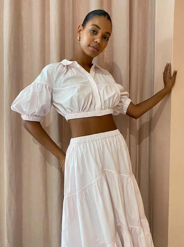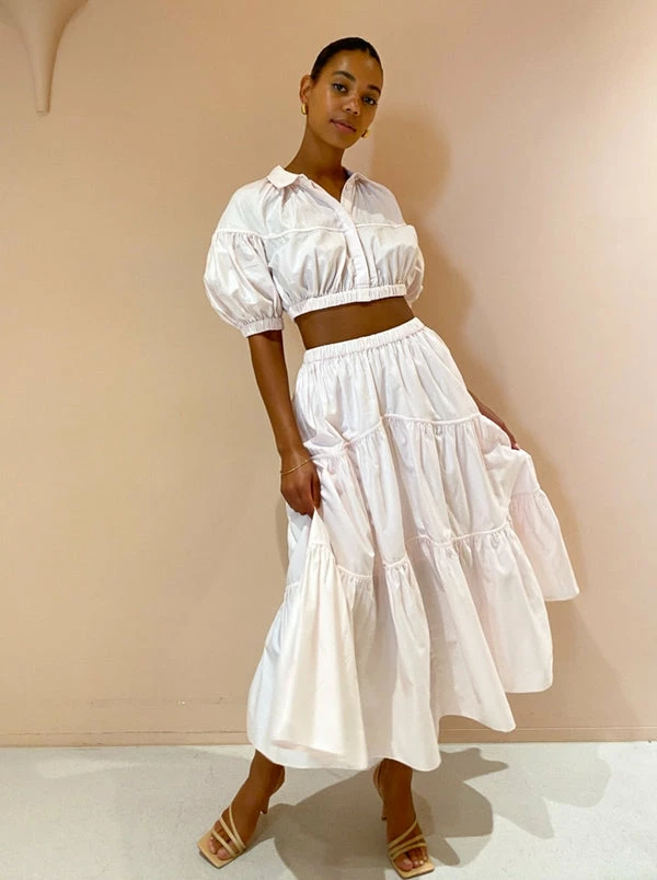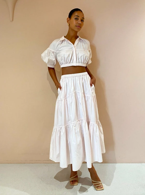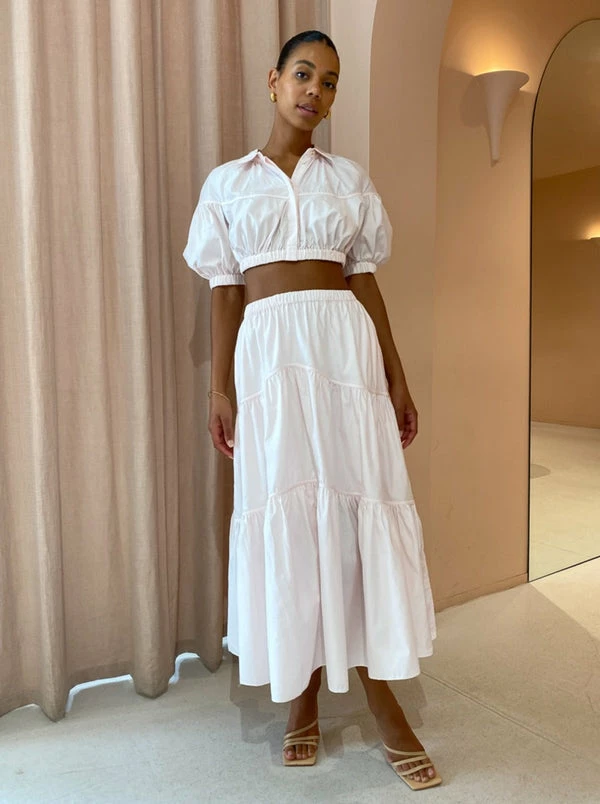 Embrace femininity in everyday styling with Acler's Marquis Skirt in Shell Pink. This breathable midi skirt is crafted from a semi-sheer Cotton fabrication and sits high on the elasticated waist before falling into a tiered hem with side pockets. Admired for the beautiful hue and elegant silhouette, this skirt is a wardrobe staple that can be styled to suit your occasion, office days through to weekend celebrations. DETAILS & CARE Fabric: 100% Cotton – Midi skirt – Short skirt lined – Elastic waistband – Inseam pockets – Crisp cotton fabrication Our Coco girl Boston wears a Size AU 8 / Small.Boston's height is 178cm. COCO STYLING TIP For your next winery getaway complete the set with the Acler Marquis Top in Shell Pink and style with Alias Mae Aspen Heel in Natural, Porter Wave Croissant Earring in Gold and Porter Triple Heirloom Ring in Gold.