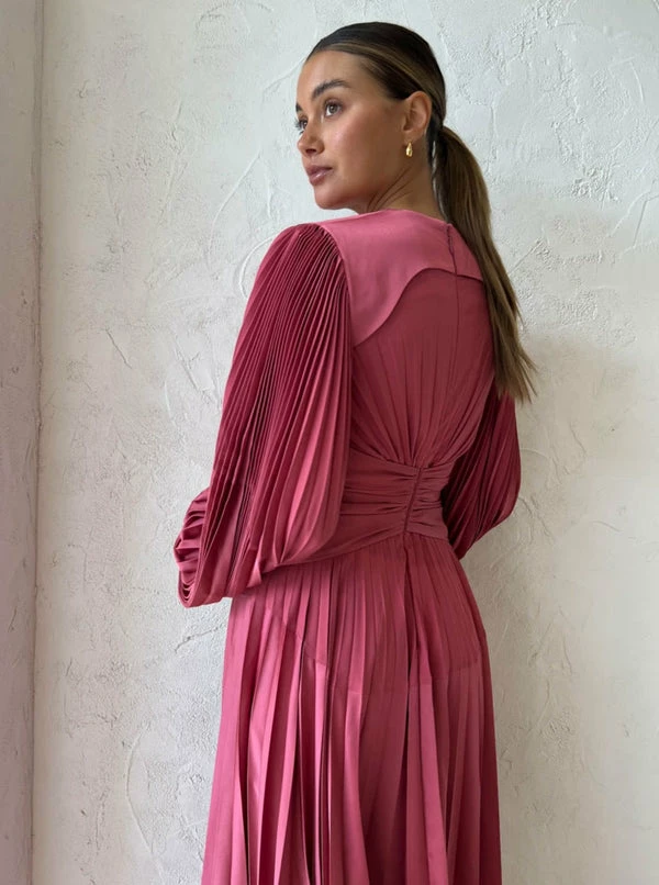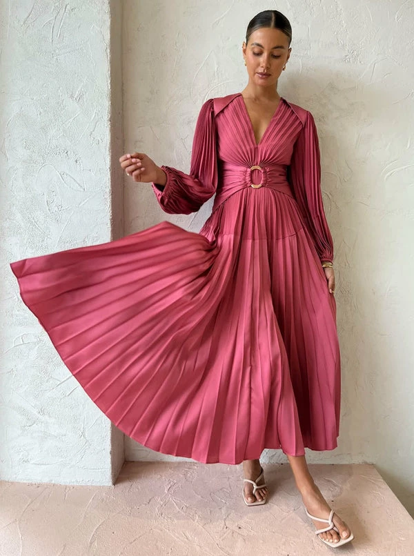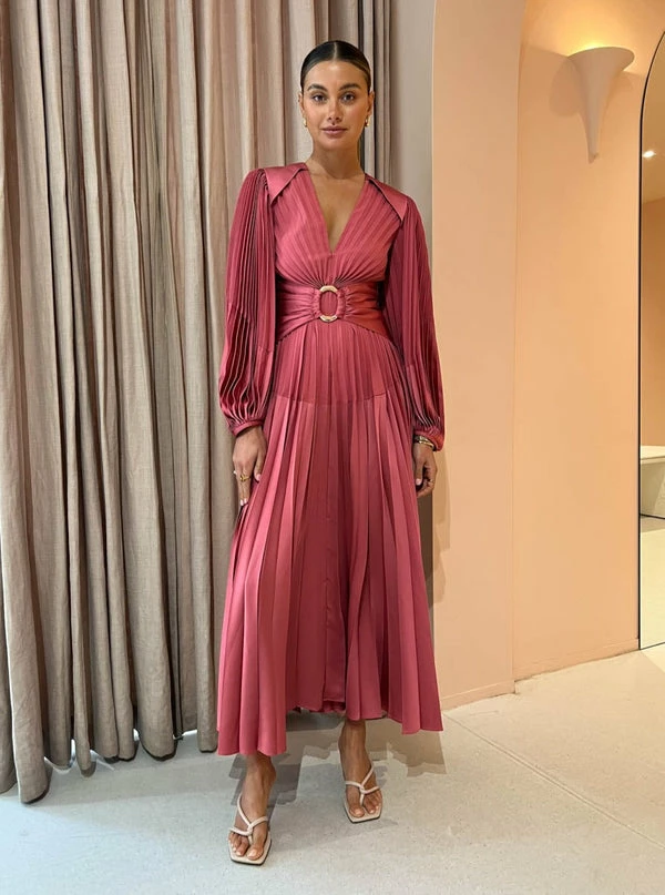 Make a bold entrance through your Spring celebrations with the Oakfield Dress in Dusty Rose from Acler. Inspired by coveted silhouettes, this silky to touch pleated maxi is a statement like no other. Cut with a plunging V neckline, it features long blouson sleeves and contrast detail at the shoulders and back neck. Celebrating feminine confidence, its cinched waist with an O ring feature and A line pleated skirt will have Coco girls at the centre of attention through weddings, Spring racing and formal soirées. DETAILS & CARE Fabric: 100% Polyester – Maxi dress – Full length sleeves – Cinched at the waist – Luxe gold hardware – V-neckline – Invisible back zip Our Coco girl Eden wears a Size 8 AU / Small. Eden's Height is 175cm COCO STYLING TIP Complete the look with the Alias Mae Baz Heel in Cream, Porter Harp Ring in Gold, Porter Tear Drop Huggies in Gold, Porter Wave Ring Set in Gold, Porter Pond Bangle in Gold, Porter Frill Cuff in Gold and the Porter Pond Ring in Gold.