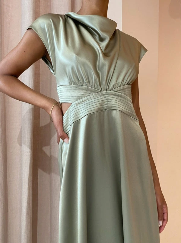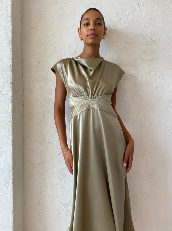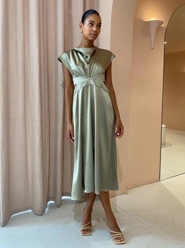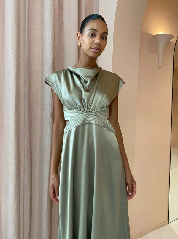 The Plympton Dress in Moss by Acler perfectly blend rich hues with effortlessly elegant silhouettes. Crafted from a soft touch fabrication, this midi dress sits fitted at the waist and relaxed throughout. Featuring a high neckline detailed with a soft cowl and cut out detail at the waist with gathered fabrication. Falling elegantly into a floaty midi hemline, the Plympton dress will be coveted for wedding celebrations, formal soirees and long ladies lunches. DETAILS & CARE Fabric: 76% Acetate 24% Polyester – Midi dress- High cowl neckline- Soft touch fabrication- Cut out detail at the waist- Invisible back zip Our Coco girl Boston wears a Size AU 8 / Small.Boston's height is 178cm. COCO STYLING TIP For formal soirees complete with Alias Mae Aspen Heel in Natural, Porter Wave Croissant Earring in Gold, Porter Tube Bangle in Gold and Porter Triple Heirloom Ring in Gold.