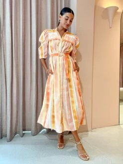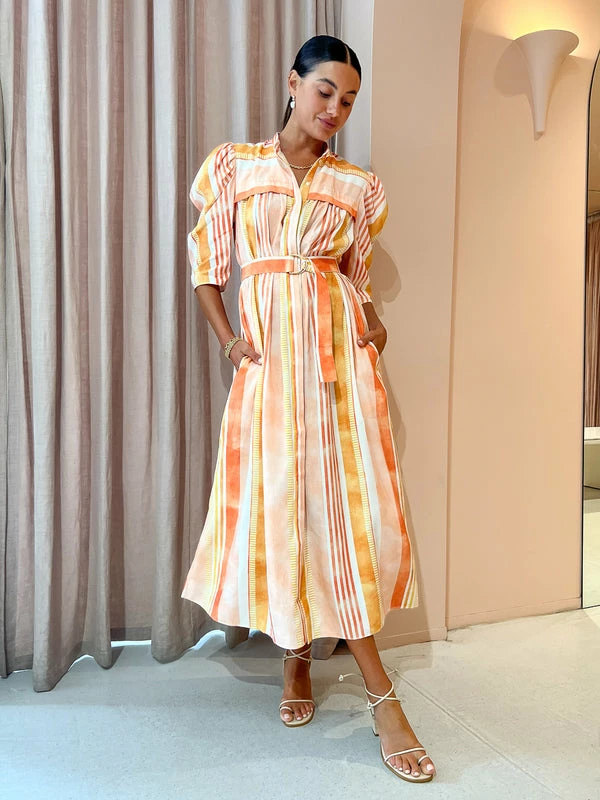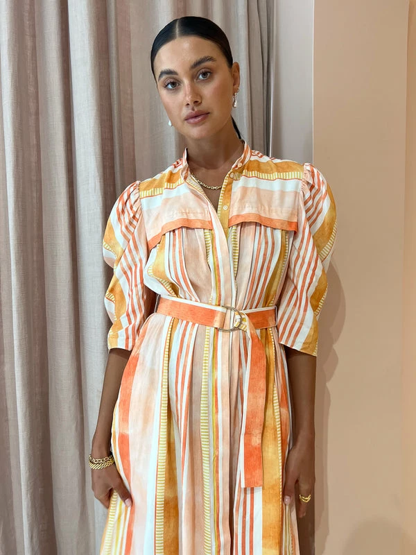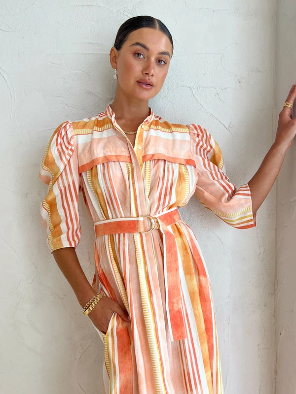 Welcome watercolour charm into your Coco Collection with the Tunstall Dress in Geo Stripe by Acler. Crafted from a easy to wear fabrication, this midi dress is a refreshing take on Aclers classic shirt dress silhouette and features elbow length sleeves, and an adjustable D-ring belt. Falling to a tiered skirt and finished with luxe gold hardware, transcend the seasons with Acler's modern classic aesthetic. DETAILS & CARE Fabric: 60% Viscose Rayon, 40% Linen- Midi dress- Button front closure- Elbow length sleeves- Removable waist belt- Luxe gold hardwareCare Instructions: Dry Clean Only.Our Coco girl Eden wears a size AU 8 / small.Eden’s height is 175 cm. COCO STYLING TIP Complete the look with the Vieux Bayonne in Bone, Aloha's Grace Heel in Corn Ivory, Arms of Eve Rae Chain Necklace in Gold, Amber Sceats Valletta Earrings in Gold, Porter Baby Link 2.0 Bracelet in Gold, Amber Sceats Coco Bracelet in Gold, Amber Sceats Grande Helena Ring in Gold Porter Triple Heirloom Ring in Gold and the Arms of Eve Eros Textured Ring in Gold.