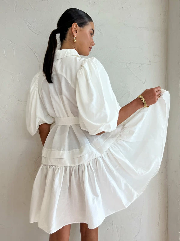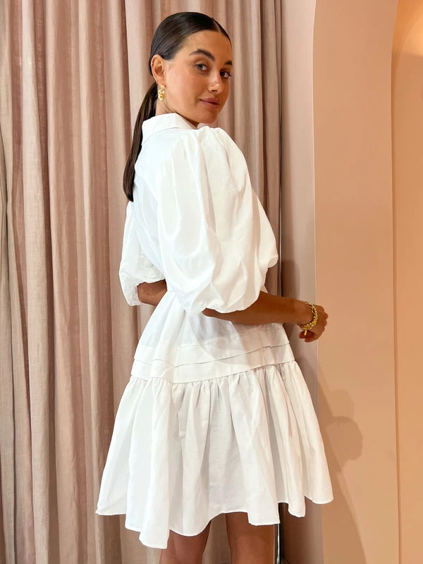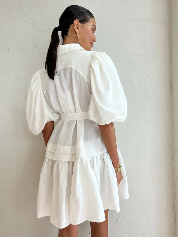 Sweep through Summer in the breezy Woodgate Dress in Ivory by Acler. Crafted from a linen blend fabrication, this flowing mini dress features a collared neckline, removable waist-belt and soft pleats towards the hem to add texture to this timeless style. Coveted by Coco girls for its accentuated statement sleeves, this mini dress will take you through the season in ease from warm weather wanderings to cocktail evenings. DETAILS & CARE Fabric: 60% Viscose Rayon, 40% Linen- Mini dress- Accentuated sleeves- Removable D-ring belt- Soft pleats toward the hem- Button front closureCare Instructions: Dry Clean Only.Our Coco girl Eden wears a size AU 8 / small.Eden’s height is 175cm. COCO STYLING TIP Complete the look with the Vieux Bayonne in Bone, Aloha's Grace Heel in Corn Ivory, Arms of Eve Rae Chain Necklace in Gold, Amber Sceats Valletta Earrings in Gold, Porter Baby Link 2.0 Bracelet in Gold, Amber Sceats Coco Bracelet in Gold, Amber Sceats Grande Helena Ring in Gold Porter Triple Heirloom Ring in Gold and the Arms of Eve Eros Textured Ring in Gold.