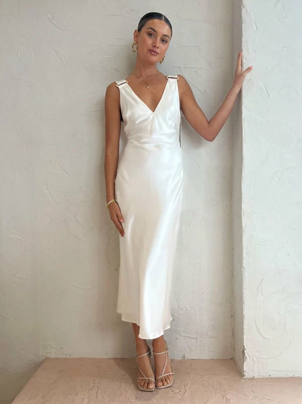 Embrace relaxed elegance with the Wycombe Dress in Ivory by Acler. Crafted from a quintessential soft to touch acetate blend fabrication, this midi dress features a v-neckline and a flattering body skimming silhouette. With an ode to quality craftsmanship, the luxe gold hardware adds a touch of glam that will have Coco girls twirling through life's special moments. DETAILS & CARE Fabric: 76% Acetate, 24% Polyester- Midi dress silhouette- Luxe gold hardware- Bodice and short skirt lined- V neckline- Invisible side zipOur Coco girl Eden wears a Size 8 AU / Small.Eden's Height is 175cm COCO STYLING TIP For your next special occasion, style with the Alias Mae Molly Heel in Cream, Porter Pond Bangle in Gold, Porter Heirloom Bangle 6mm in Gold, Porter Wave Ring Set in Gold, Porter Chunky Belcher Bracelet in Gold, Reliquia Telde Necklace in Gold, Porter Harp Ring in Gold and the Reliquia Over and Over Earrings in Gold.