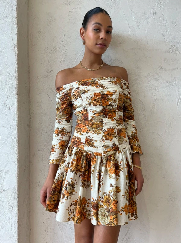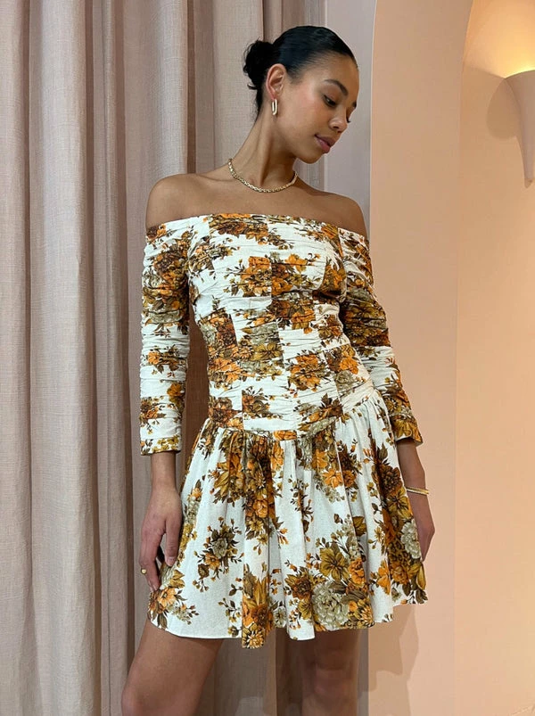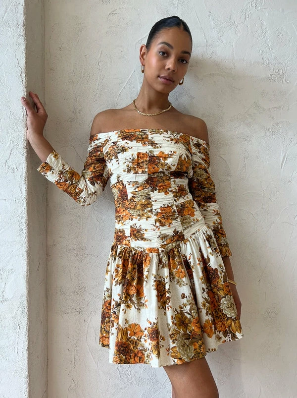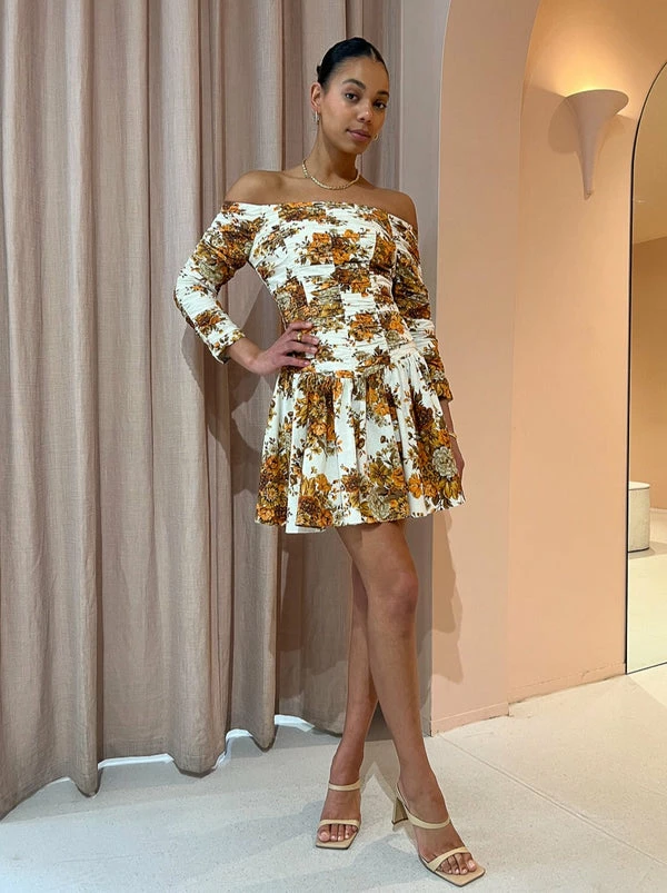 Twirl through the seasons in Alemais Derby Mini Dress in Cream/Rust. Delicately crafted from a cotton poplin fabrication this vintage inspired mini dress is printed with autumnal florals. With a flattering off the shoulder straight neckline it sits fitted through the body, featuring horizontal gathered details on the bodice and long sleeves. Falling into a fluted mini skirt hemline, Coco girls love the sweet silhouette of the Derby Dress for sunset soirees and romantic dinner dates. DETAILS & CARE Fabric: 100% Cotton Poplin – Off the shoulder straight neckline - Horizontally gathered bodice panels - Gathered long sleeves - Gathered bodice - Fluted mini skirt - Invisible zip at back - True to size Our Coco girl Boston wears a size 8 AU / S.Boston's height is 178cm. COCO STYLING TIP Complete the look with the Alias Mae Cassie Heel in Natural, the Porter Frill Cuff in Gold and finish with the Reliquia Lucille Earrings in Gold for your next special occasion. Style back with the Superga X Coco Velcro Leather Sneaker in White/Pink to casualise your look.