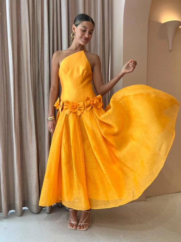 Embrace nostalgic party dressing with the Macie One Shoulder Rosette Dress in Saffron from Alemais.Crafted from a mid-weight taffeta with a contrast organza skirt, this form fitting maxi dress features an asymmetric neckline, a dropped waistline adorned with statement bows before falling into a soft and fluid skirt. With the retro flare and bold orange hue, this maxi dress is the perfect pairing for celebration season. DETAILS & CARE Fabric: Main: 100% Recycled Nylon Taffeta Contrast: 47% Silk 53% Linen organza – Maxi Dress – Slim fit- Asymmetric one shoulder neckline- Unlined- Zip fastening- Contrast skirt – Bow detailing around dropped waistCare Instructions: Dry Clean only. Our Coco girl Eden wears a size AU 8 / small.Eden's height is 175 cm. COCO STYLING TIP Finish the look with the Camilla and Marc Vigo Heel in Ivory, Porter Pond Ring in Gold, Porter Pond Bangle in Gold, Porter Wave Ring Set in Gold, Reliquia Over and Over Earrings in Gold, Arms of Eve Helios Cuff Bracelet in Gold,