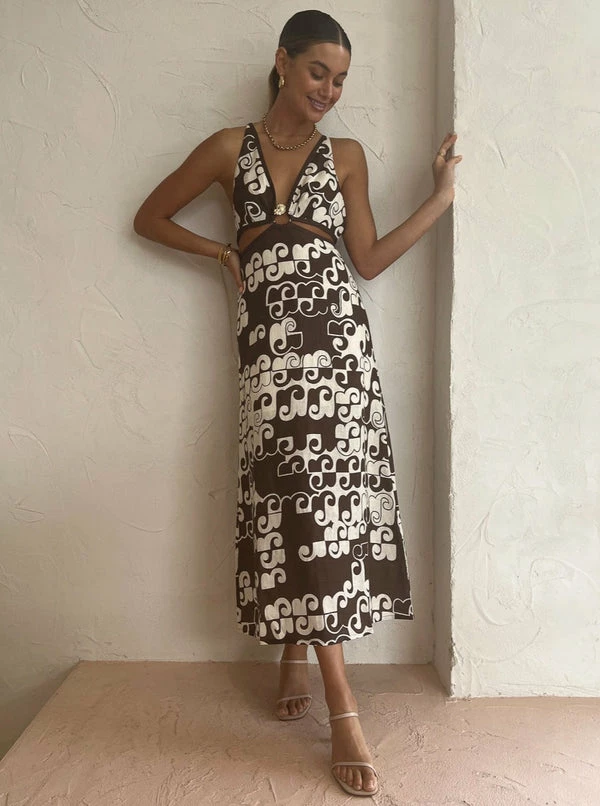 Dance under the moonlight with the Maurice Cut Out Midi Dress in Chocolate from ALÉMAIS. Crafted from Linen, sleek midi dress flatters the femme silhouette with a toggle fastened waist and a bralette style bodice. Exposing the body with waist cut outs and an open back, it features elasticated straps that offer comfort for every Coco girl. Slightly flaring at the hem, the Maurice Midi will have you twirling endlessly from cocktail hours into dinner dates and formal soirées. DETAILS & CARE Fabric: 100% Linen- Maxi length – Bralette design with waist cut out – Open back with elasticated straps- Custom toggle at waist- Slightly flared skirt- Partially linedCare Instructions: Dry Clean Only.Our Coco girl Eden wears a size AU 8 / small.Eden’s height is 175 cm. COCO STYLING TIP Complete this special occasion look with the Camilla and Marc Vigo Heel in Ivory, Porter Chunky Belcher Necklace 2.0 in Gold, Porter Heirloom Bangle 6mm in Gold, Porter Wave Ring Set in Gold, Porter Chunky Belcher Bracelet in Gold, Reliquia Trending Upwards Hoops in Gold and the Porter Pond Bangle in Gold.
