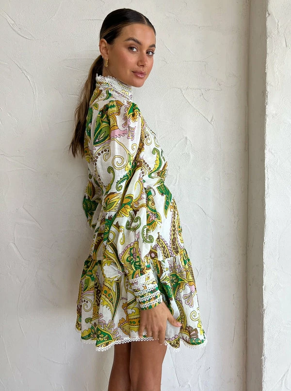 The Octavia Ruffle Mini Dress in Ivory from Alemais has been designed to mesmerise. Curated in a relaxed shirtdress silhouette the Octavia Mini features trim edging, pin-tuck detailing and balloon sleeves with buttoned cuffs. Falling into a gathered flounced mini skirt, the mini style is an intoxicating easy to wear style for your next lunch-in, wedding or weekend getaway. DETAILS & CARE Fabric: 100% Ramie – Relaxed shirtdress silhouette- Trim edging- Pintuck detailing- Stand collar- Balloon sleeves with buttoned cuffs- Gathered flounce hemline- Shell button fastening through front – Self tie belt with custom toggles – Slip included- True to sizeOur Coco girl Eden wears a size AU 8 / small.Eden's height is 175 cm. COCO STYLING TIP Complete the look with the Alohas Twist Strap in Camel, Porter Mali Hoops in Clear, Porter Chunky Belcher Necklace 2.0 in Gold, Porter Wave Ring Set in Gold, Porter Harp Ring in Gold, Porter Pond Bangle in Gold, Porter Frill Cuff in Gold and the Porter Heirloom Bangle 6mm in Gold.