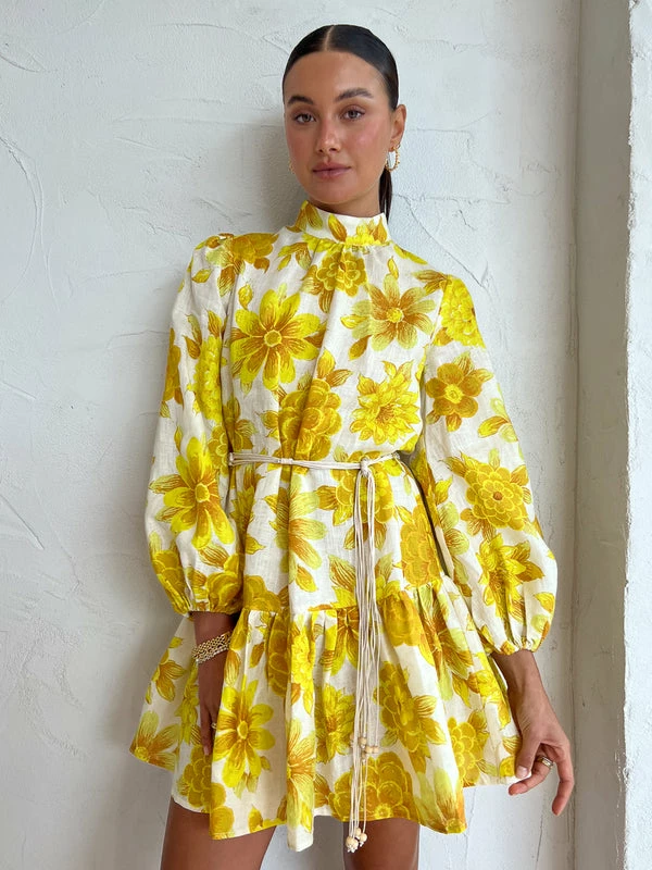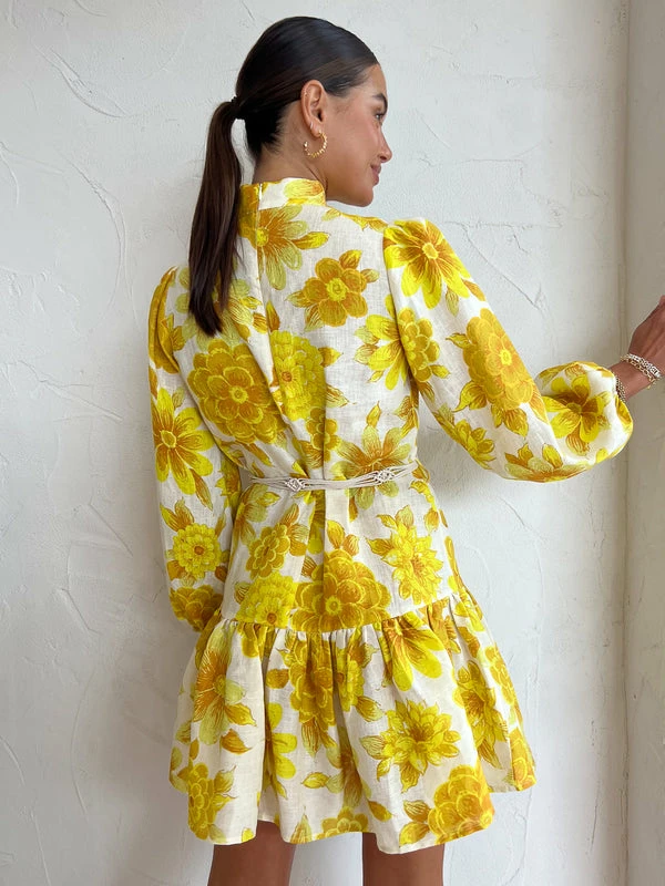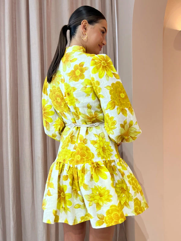 The art of dopamine dressing, ALÈMAIS introduces us to the Sonny Mini Dress in Lemon. Crafted from a soft to touch fabrication, this relaxed smock mini features a collar with a slight gather, sleeve with elasticised cuff and a playful skirt with a gathered hem flounce. Finished with a contrasting macrame belt, Coco girls love the Sonny Mini for long lunches, Summer weddings and cocktail hour. DETAILS & CARE Fabric: Main: 100% Ramie Contrast: 100% Linen - Relaxed smock silhouette – Collar with a slight gather- Sleeve with elasticated cuff – Skirt with gathered hem flounce- Macrame belt Care Instructions: Dry Clean Only.Our Coco girl Eden wears a size AU 8 / small.Eden’s height is 175 cm. COCO STYLING TIP Complete the look with the Alohas Grace Heel in Corn Ivory, Amber Sceats Grande Helena Ring in Gold, Arms of Eve Eros Textured Ring in Gold, Amber Sceats Bella Earrings in Gold, Porter Chunky Belcher Bracelet in Gold and the Porter Baby Link 2.0 Bracelet in Gold.