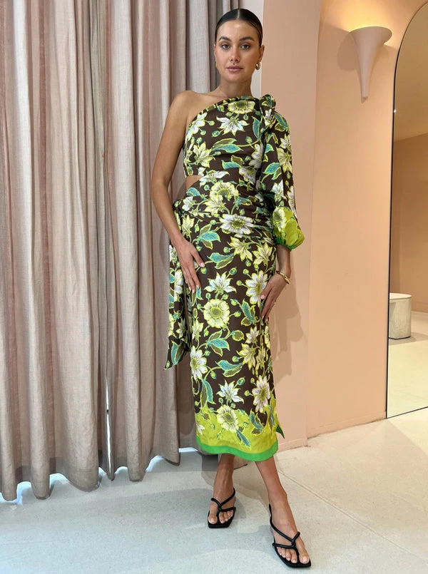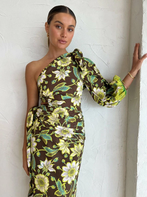 Experience luxury in the Winnie One Shoulder Midi Dress in Chocolate from Alemais. Designed in a recycled poly taffeta, the Column silhouette features a one shoulder detail with an adjustable bow and waist. This ultra modern design from Alemais is a Coco favourite for all your Spring lunches, upcoming birthday celebrations and sunset drinks. DETAILS & CARE Fabric: 100% Recycled Poly Taffeta – Column silhouette dress with one shoulder construction – Adjustable bow at shoulder and waist- Tucked waist detail- Asymmetric neckline- Balloon sleeve with elasticated cuff – Cut out detail at waist- Partially lined- True to sizeOur Coco girl Eden wears a size AU 8 / small.Eden's height is 175 cm. COCO STYLING TIP Complete the look with the Alias Mae Baz Heels in Black, Porter Chunky Belcher Necklace 2.0 in Gold, Reliquia Trending Upwards Hoops in Gold, Porter Baby Link Bracelet in Gold, Porter Triple Heirloom Ring in Gold, Porter Heirloom Bangle 6mm in Gold, Amber Sceats Hunter Bracelet in Gold, Porter Harp Ring in Gold and the Porter Pond Ring in Gold.