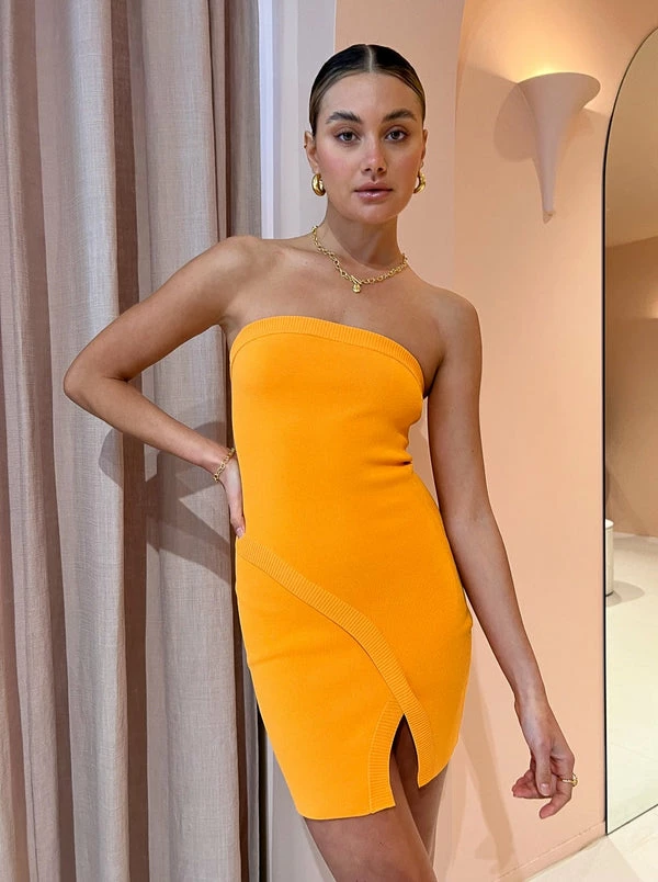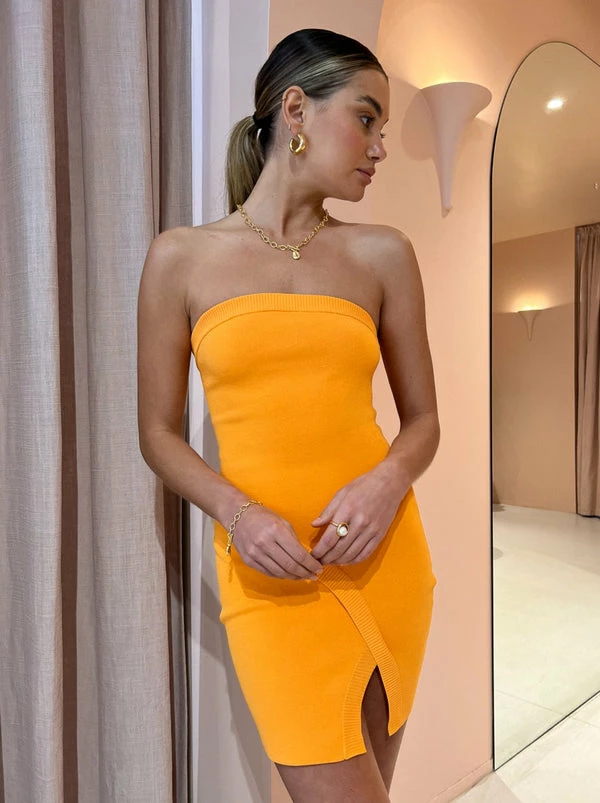Sweeten Summer soirées with the fruity Mandarin hue of Bec + Bridge's Cherry Knit Strapless Mini Dress. Fitted through the body, this strapless mini dress is crafted from a stretchy knit fabrication in Mandarin. A slip on style it's detailed with contrast ribbed edging and an asymmetrical skirt with scoop cut out. Coco girls love this mini moment for golden hour drinks, birthday celebrations and romantic date night celebrations. DETAILS & CARE Fabric: 53% Viscose 45% Nylon 2% Elastane – Strapless – Mini dress – Fitted – Asymmetrical skirt with scoop cut out – Contrast ribbed edging – Pull on silhouette – Slight stretch Care instructions: Cold hand wash separately using mild wool detergent. Do not bleach, rub, soak or wring. Do not tumble dry, gently spin to remove excess water. Reshape when wet, lay flat to dry. Light steam if required. To prevent stretchy, store flat, do not hang. Do not dry clean. Our Coco girl Eden wears a size 8 AU / small. Eden's Height is 175cm. COCO STYLING TIP For your next sunset soiree complete with the Alias Mae Ari Heel in Team, Amber Sceats Coco Necklace in Gold, Amber Sceats Coco Bracelet in Gold and the Reliquia Trending Upwards Hoops in Gold.