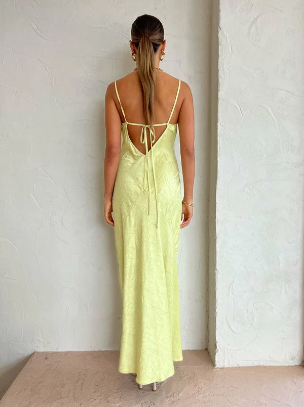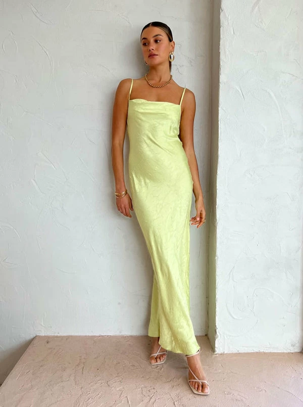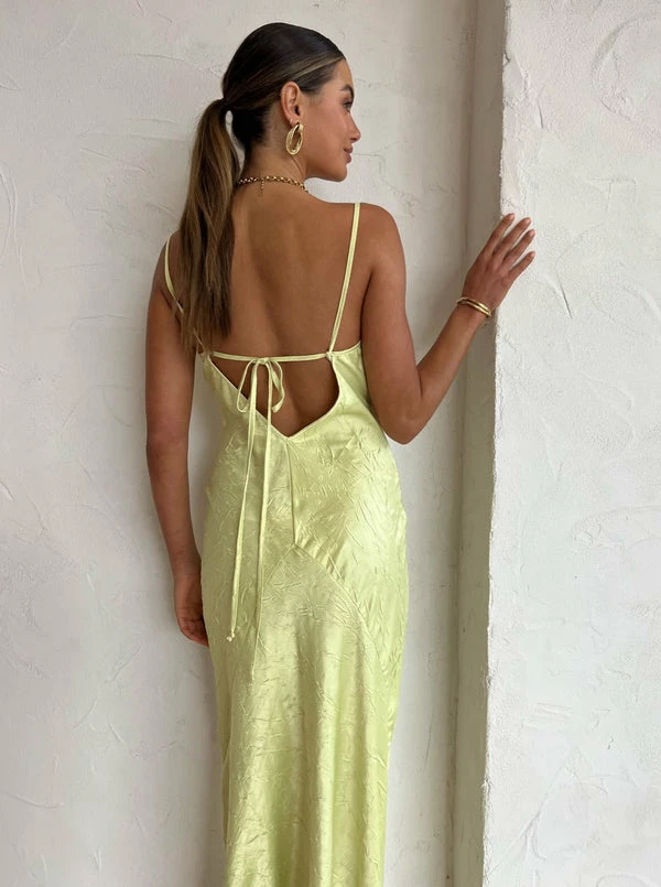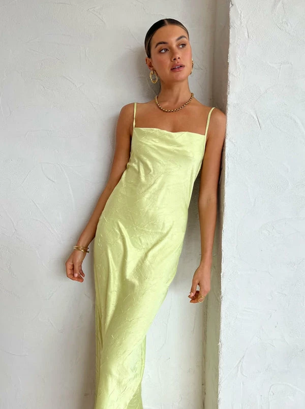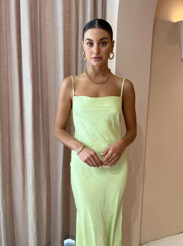 Bec + Bridge introduces us to a wash of citrus hues and timeless silhouettes with the Lani Maxi Dress in lime. Crafted from a crushed polyester, this bias cut maxi features an alluring cowl neck, godet panel and thin straps that tie at an open triangular back. Designed to be fitted at the bust and hips, the dress then falls to a relaxed fit through the body of the skirt. Its simplistic elegance and unexpected tie back detailing will make a statement at your next Coco calendar event. DETAILS & CARE Fabric: 100% Polyester- Bias cut – Cowl neck- Godet Panel- Dress is accessed through thin straps that tie at an open triangular back- Hand crushed fabric – each piece will vary in texture and flatness – Designed to be fitted at the bust and hips and relaxed through the body of the skirt. Care Instructions: Cold hand wash separatelyOur Coco girl Eden wears a size AU 8 / small.Eden’s height is 175 cm. COCO STYLING TIP Complete this special occasion look with the Alias Mae Zi Heels in Cream, Porter Tear Drop Earrings in Gold, Porter Pond Ring in Gold, Porter Pond Bangle in Gold, Reliquia Maxima Necklace in Gold, Porter Wave Ring Set in Gold, Porter Chunky Belcher Bracelet in Gold, Porter Heirloom Bangle 6mm in Gold and the Vieux Chartreaux Sunglasses in Bone.