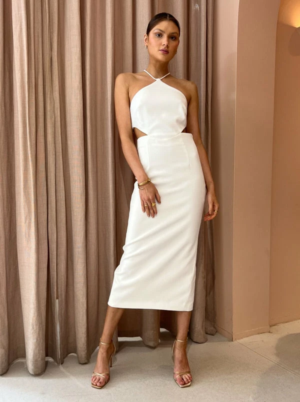 BY JOHNNY'S Fresco Halter Maxi Dress in Ivory is an elegant staple that you will have in your wardrobe for years to come.Crafted from a figure hugging fabrication with slight stretch, this maxi dress features a halter bodice, a skirt that sits below the natural waistline and is finished with a split at the back hem.With the unique diamond shape neckline and lace up back bodice, this maxi dress is the perfect plus one for life's special moments, from wedding celebrations to birthdays and engagements. DETAILS & CARE Fabric: Main: 97% Polyester 3% Elastane Lining: 97% Polyester 3% Elastane- Halter bodice with diamond shape neckline- Supportive and figure hugging fabric- Slight stretch to the fabric- Skirt sits below the natural waistline- Split at backCare Instructions: Dry Clean Only.Our Coco girl Ella Grace wears a size AU 8 / small.Ella Grace’s height is 178cm. COCO STYLING TIP Complete this glamorous look with the Alias Mae Mia Heel in Champagne, Porter Wave Ring Set in Gold, Porter Heirloom Bangle 6mm in Gold, Porter Paris Huggies, Porter Harp Ring in Gold, Porter Frill Cuff in Gold and the Amber Sceats Coco Bracelet in Gold.