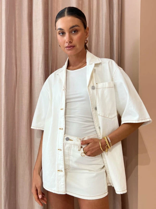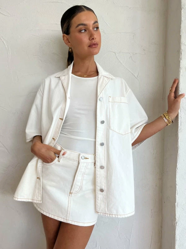 CAMILLA AND MARC add a hint of 90s nostalgia to your summer style with the Limia Denim Mini Skirt in Salt White. Crafted from 100% Cotton Denim, this White mini skirt is designed to sit low rise. Cut in a relaxed fit, it features a self waistband with a shank button fly opening, pockets and back yoke panels. Admired for its style versatility and neutral hue, the Limia Skirt will become your seasonal hero for sunshine days. DETAILS & CARE Fabric: 100% Cotton Denim- Low rise- Mini skirt – Relaxed fit – Self waistband with single logo embossed metal shank- Cut away pockets with logo engraved rivets- Coin pocket detail in right pocket- Shank button fly front opening- Back yoke panels- Patch pockets on back- Twin needle and single needle topstitching detail throughoutCare Instructions: Cold gentle hand wash separately.Our Coco girl Eden wears a size AU 8 / small.Eden's height is 175 cm. COCO STYLING TIP Style with the CAMILLA AND MARC Miles Tank in Soft White, CAMILLA AND MARC Santiago Blazer in Lemon, Alias Mae Baz Heels in Cream, Porter Harp Ring in Gold, Porter Tear Drop Huggies in Gold, Porter Wave Ring Set in Gold, Porter Pond Bangle in Gold, Porter Frill Cuff in Gold and the Porter Hailey Twist Necklace in Gold.