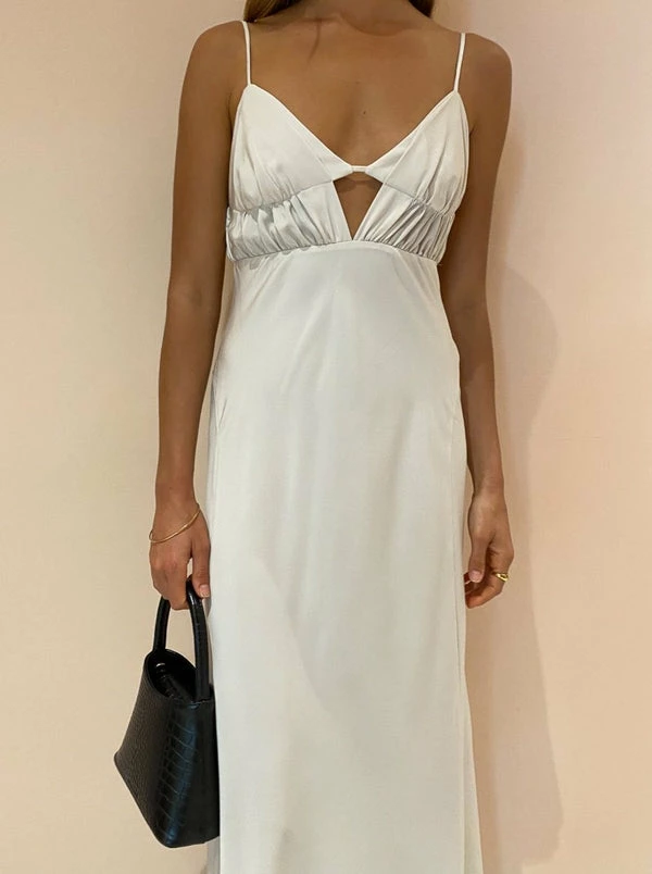 Slip into endless romance and effortless elegance in the Sola Slip Dress in Ivory by Camilla & Marc. Crafted from a luxurious Polyester blend fabrication, this midi dress features a layered bust panel with a deep V and gathering detail. Falling elegantly into a floaty midi hem, the Sola skims and flatters in all the right ways. Designed with the Coco girl in mind, this flattering slip will be perfect for engagement festivities, birthday celebrations and cocktail hour. DETAILS & CARE Fabric: 97% Polyester and 3% Spandex – Gathered bodice slip dress- Layered bust panel with deep V neckline- Adjustable shoestring straps with gunmetal rings- Invisible zipper on side seamCare Instructions: Dry clean only Our Coco Girl Eden wears a Size AU 8 / Small.Eden's height is 175cm. COCO STYLING TIP Complete this elegant midi moment for those special Coco moments with the Mara & Mine Savannah Heels in Black, Brie Leon Chloe Bag in Black, Porter Horn Hoops in Gold, Porter Bubble Ring in Gold and Heirloom Bangle in Gold.