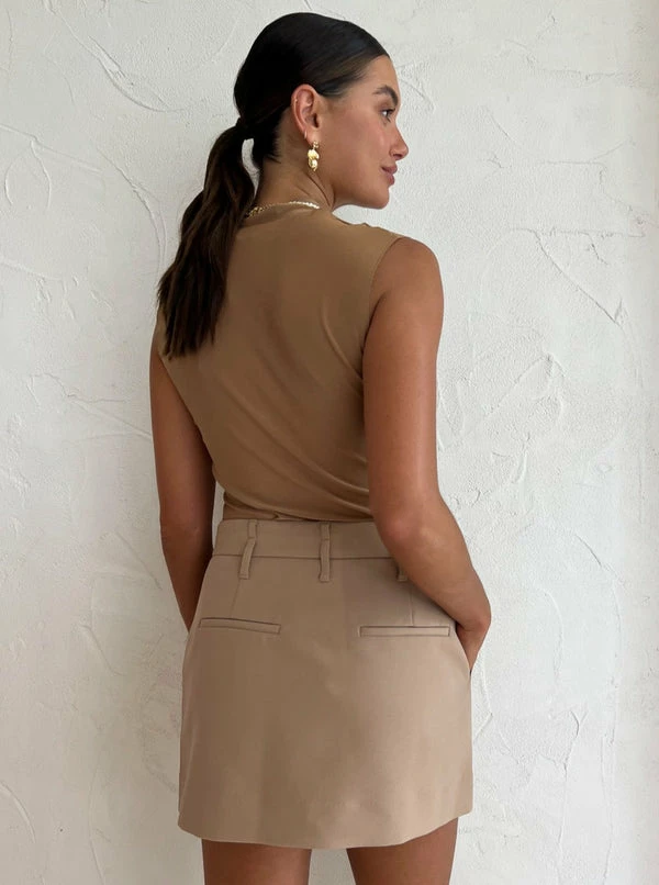 Celebrate timeless dressing with the Camilla and Marc Sterling Mini Skirt in Camel. Crafted from a speciality suiting fabrication in a low-rise silhouette, this skirt is defined by its short length, belt loops, and pin-tuck detailing on the front and back waist darts for a tailored fit. Coveted for its versatility, pair it with the matching Sterling Mini Skirt in camel for the perfect desk to dusk ensemble. DETAILS & CARE Fabric: Main 75% Polyester, 20% Viscose Rayon and 5% Elastane Lining: 100% Recycled Polyester- Low rise mini skirt- Extended waistband with hook and bar closure- Fly front opening with auto-lock zipper- Feature low waist belt loops with single needle topstitching- Cutaway pockets- Permanent pressed pleat on front legs- Back waist darts- Welt pockets at back- Fully lined styleCare Instructions: Dry clean only. Our Coco girl Eden wears a size AU 8 / small.Eden’s height is 175 cm. COCO STYLING TIP For special occasion styling, complete the look with the Camilla and Marc Saint Sleeveless Top in Toffee, LMS The Violet in Black, Arms of Eve Rae Chain Necklace in Gold, By Charlotte Eye of Purity Pearl Choker in Gold Vermeil, Amber Sceats Klein Earrings in Gold, Porter Margot Ring in Gold, Porter Chunky Belcher Bracelet in Gold and the Amber Sceats Grande Helena Ring in Gold.