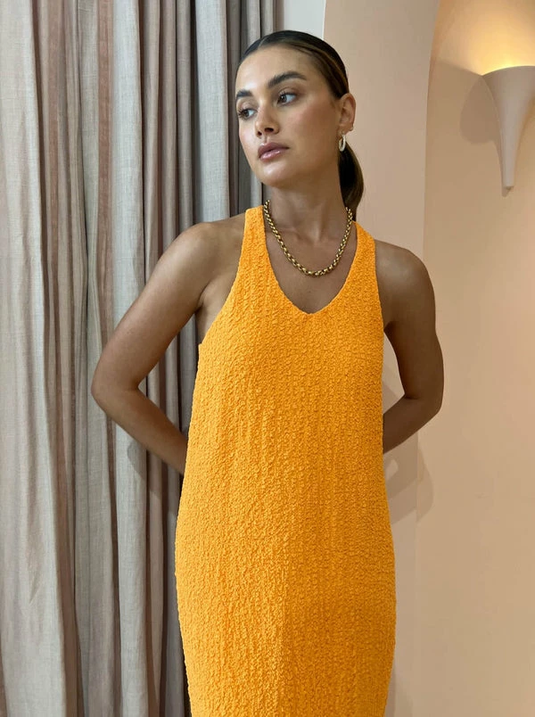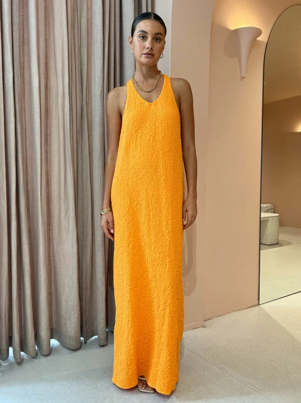 Enter the season of colour with CAMILLA AND MARC's Toledo Racer Back Dress in Dusty Orange. Delicately crafted from a unique textured Cotton-based fabrication, this racer back maxi dress features a straight cut silhouette and is finished with a knot at the back.With the bold orange hue and minimalistic design, Coco Girls are coveting this dress for their next cocktail party, birthday celebration and formal dinners. DETAILS & CARE Fabric: 98% Cotton and 2% Elastane- Scoop neckline with clean finish edges bagged out into body lining – Racer back neckline with knot made in self- Full length straight silhouette – Double turn hem finish – Partially lined style in power mesh for supportCare Instructions: Dry clean only.Our Coco girl Eden wears a size AU 8 / small.Eden’s height is 175 cm. COCO STYLING TIP Style with the Alias Mae Baz Heels in Cream, Porter Pond Bangle in Gold, Porter Frill Cuff in Gold,Porter Chunky Belcher Necklace 2.0 in Gold, Porter Pond Ring in Gold, Porter Paris Huggies and the Porter Wave Ring Set in Gold.