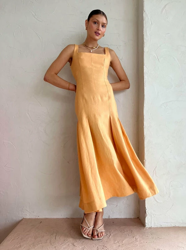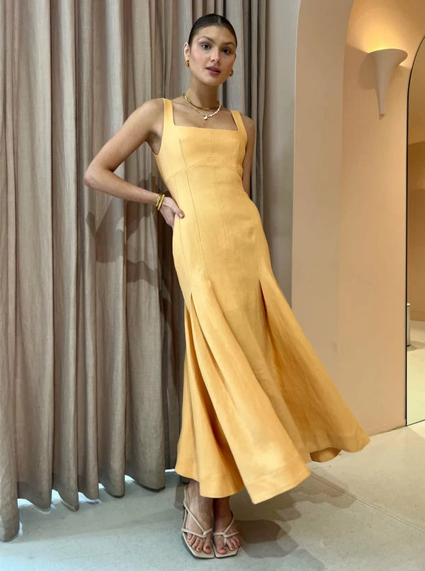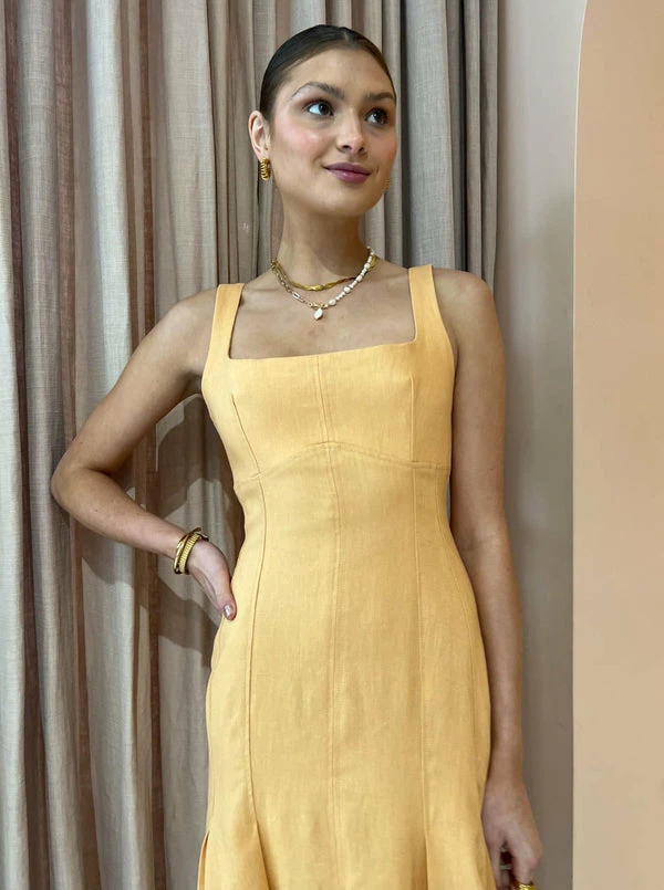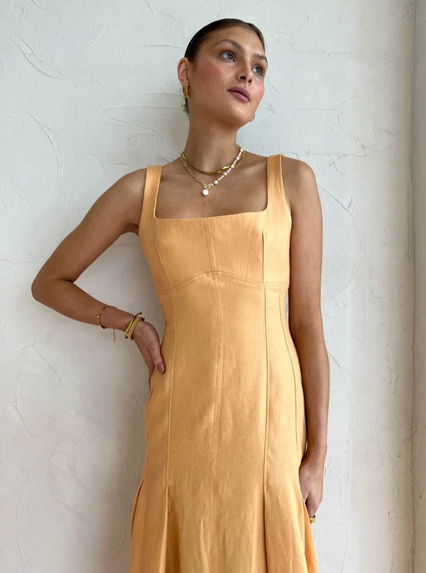 Exclusive To Coco. Celebrate life's special moments with the modern classic Charlee Pleat Dress in Mango from CLEA. Crafted from 100% Cotton, this midi dress features a flattering square neckline and panelling which forms into deep pleats and falls into a full hem midi length skirt.Showcasing a flattering neckline and feminine silhouette, this midi dress will be a Coco must-have for birthday celebrations, ladies lunches and wedding celebrations. DETAILS & CARE Fabric: Main: 100% Cotton Contrast: 100% Cotton- Midi dress- Square neckline- Bustier shaping and panelling- Deep pleats in a full hem skirt- Deep back neckline- Centre back invisible zipperCare Instructions: Dry clean onlyOur Coco girl Ella Grace wears a size AU 8 / small.Ella Grace’s height is 176 cm. COCO STYLING TIP Complete the look with the Alias Mae Baz Heel in Natural, the Brie Leon mini Chloe Bag in Natural Stone, the By Nicola Sol Scarf Top in Large Sol, the Porter Triple Heirloom Ring in Gold, the Porter Frill Cuff in Gold, the Reliquia Serpa Necklace in Gold/Pearl, the Porter Spiral Hoops in Gold and finish with the Porter Wave Croissant Ring in Gold.