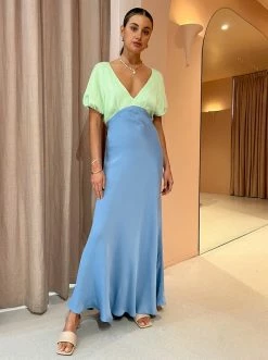 A Coco Exclusive. Dominique Healy blends refined silhouettes and muted palettes in the Adaline Dress in Mint/Powder Blue. Crafted from a silky to touch Rayon, this maxi is cut on the bias to flatter the femme silhouette with its relaxed nature. Featuring a flattering v neckline and romantic puff sleeves before falling effortlessly into a relaxed maxi skirt. Finished with an elasticised back to further accentuate the waist, Coco girls adore this sweet dress for ladies lunches, garden weddings and birthday celebrations. DETAILS & CARE Fabric: 100% Rayon – Maxi dress – V neckline – Puff sleeve – Elasticated sleeve opening- Gathered hemline – Under-bust seam Our Coco girl Eden wears a size 8 AU / Small. Eden's height is 175cm. COCO STYLING TIP Compliment this romantic moment with the Alias Mae Ari Heels in Cream, Reliquia Serpa Necklace in Gold/Pearl, the Amber Sceats Hudson Bracelet in Gold and Reliquia Lorca Earrings and Thalia Ring in Pearl/Gold.