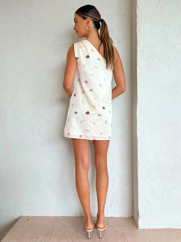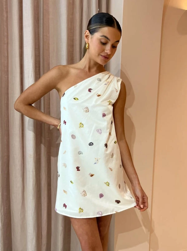 The summer mini moment of the season, Gyre introduces us to the Claire Mini Dress in Shell.Delicately crafted from a Cotton Silk blend, the Claire Mini Dress features a fitted sillhouette and one shoulder design with gathered detailingPainted Ocean motifs by Australian Artist Prudence De Marchi, turn heads as you twirl through your Summer of endless occasions. DETAILS & CARE Fabric: Main: 30% Silk, 70% Cotton Lining: 30% Silk, 70% Cotton- One shoulder design – Mini Dress- Gathered detailing on shoulder- Sustainably sourced fabricationOur Coco girl Eden wears a size AU 8 / small.Eden’s height is 175 cm. COCO STYLING TIP For your next special occasion, style with the Alias Mae Lin Heels in Cream, Reliquia Trending Upwards Hoops in Gold, Porter Pond Bangle in Gold, Porter Harp Ring in Gold, Porter Heirloom Bangle 6mm in Gold and the Porter Wave Ring Set in Gold.