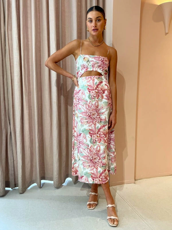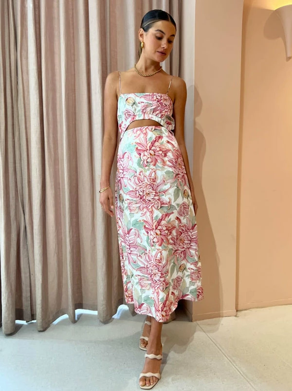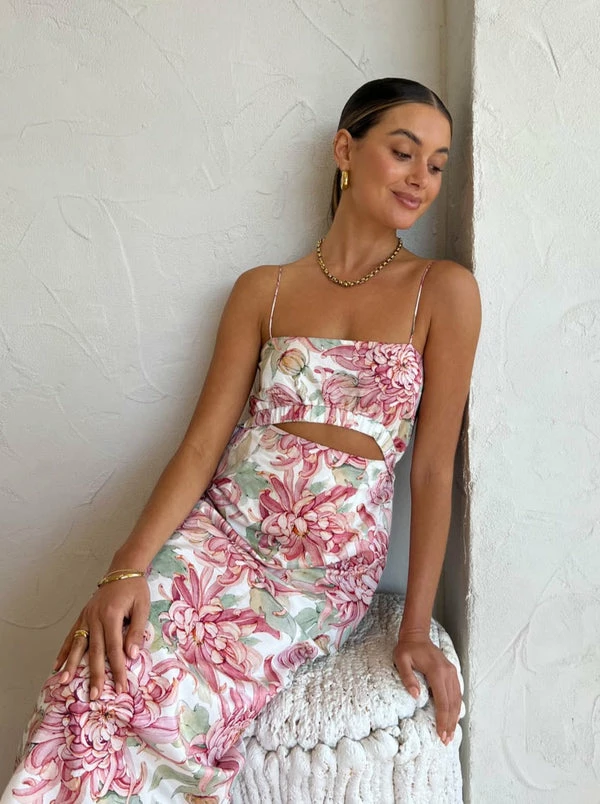 The Prudence Dress in Chrysanthemum from Gyre is a rich in feminine charm for your special occasion wardrobe. Delicately crafted from a Cotton Silk blend. The Prudence Dress is cut with a square neckline and fits slim the bodice with rouleau straps and a waist cut out with an elasticated under-bust, before falling straight to a midi length. Admired for it's vintage inspired floral print, the Prudence is the perfect accompaniment for your upcoming birthday celebrations, weddings and long lunch occasions. DETAILS & CARE Fabric: Main 30% Silk, 70% Cotton Satin Lined: 30% Silk, 70% Satin- Sustainably sourced fabrication- Midi dress- Rouleau straps- Square neckline- Elasticated under-bust- Waist cut out- Bandeau style bodice- Straight skirtOur Coco girl Eden wears a size AU 8 / small.Eden ’s height is 175cm. COCO STYLING TIP Complete the look with the Alias Mae Zi Heels in Cream, Reliquia Trending Upwards Hoops in Gold, Porter Pond Bangle in Gold, Porter Harp Ring in Gold, Porter Chunky Belcher Necklace 2.0 in Gold, Porter Heirloom Bangle 6mm in Gold and the Porter Wave Ring Set in Gold.