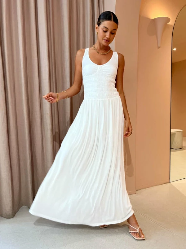 Hansen & Gretel has us dreaming of island escapes in the Fresca Dress in Ivory.Crafted from a semi sheer cotton jersey, this maxi dress with a shirred waist features a scooped neckline, wide shoulder straps and full heavily gathered skirt. This modern classic silhouette has us seeking holiday essentials that never goes out of fashion. Coco Girls adore this maxi dress for those weekend getaways and island getaways. DETAILS & CARE Fabric: Main 95% Cotton, 5% Elastane- Maxi dress- Semi sheer cotton jersey- Scooped neckline- Shirred waist panel- Low open backCare Instructions: Cold hand wash, dry cleanableOur Coco girl Eden wears a size AU 8 / small.Eden's height is 175 cm. COCO STYLING TIP Style with the Alias Mae Baz Heels in Cream, Porter Mail Hoops in Clear, Porter Chunky Belcher Necklace 2.0 in Gold, Porter Heirloom Bangle 6mm in Gold, Porter Frill Cuff in Gold, Porter Pond Bangle in Gold, Porter Wave Ring Set in Gold, and Porter Harp Ring in Gold.