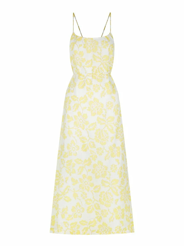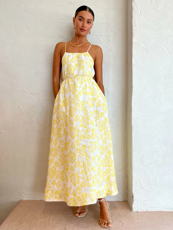 Hansen & Gretel has us dreaming of a Sicilian Summer with the Matilda Dress in Soliel Floral. Crafted from a ramie fabrication, this maxi dress features a scooped neckline and two adjustable straps that can tie around the waist to accentuate and flatter. Coveted by Coco girls for its unexpected low back, float effortlessly in this maxi dress from day to night and everywhere in between. DETAILS & CARE Fabric: Main: 100% Ramie Lining: 100% Cotton- Scooped neckline- Fully lined – Low back – Adjustable straps – Wraps around waistCare Instructions: Gentle cool hand-washOur Coco girl Eden wears a size AU 8 / small.Eden’s height is 175 cm. COCO STYLING TIP For your next special occasion, complete the look with the Alohas Bellini Heel in Ivory, Amber Sceats Grande Helena Ring in Gold, Arms of Eve Eros Textured Ring in Gold, Reliquia Thalia Ring in Pearl/Gold, Amber Sceats Emma Earrings in Gold, Porter Chunky Belcher Bracelet in Gold, Porter Baby Link 2.0 Bracelet in Gold and the Arms of Eve Rae Chain Necklace in Gold.