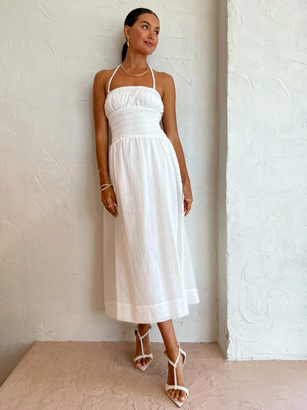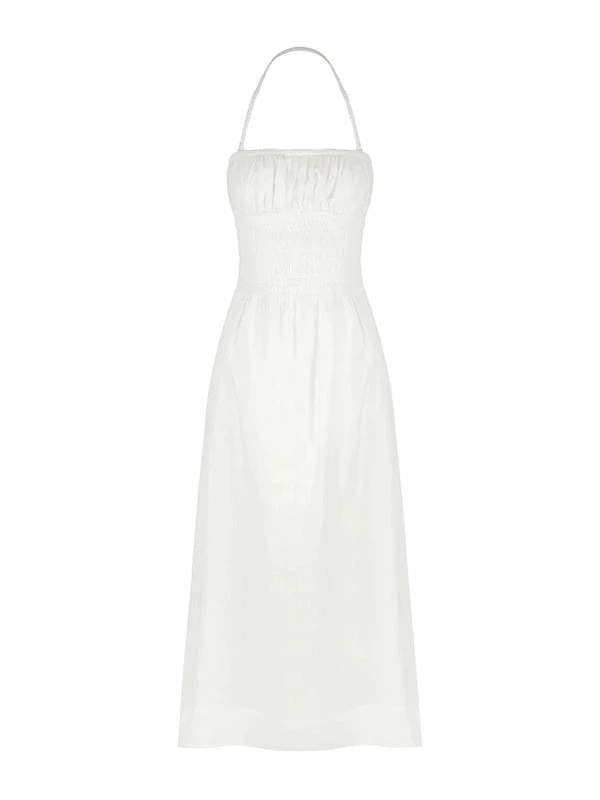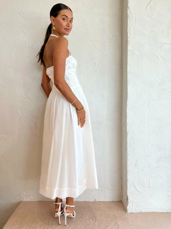 A summer suitcase hero, Hansen & Gretel welcomes the Tulum Dress in Ivory. Crafted from a ramie fabrication, this midi dress features a removable halterneck that is lined and shirring throughout the bodice before cascading into a full skirt. Easy and breezy, pair this midi dress with sandals to stroll through balmy sunsets or heels to dance through twilight soirees. DETAILS & CARE Fabric: Main: 100% Ramie Lining: 100% Cotton- Removable Halter straps – Shirred Bodice – Full Skirt – Lined Care Instructions: Gentle cool hand-washOur Coco girl Eden wears a size AU 8 / small.Eden’s height is 175 cm. COCO STYLING TIP Complete this glamorous look with the Camilla and Marc Vigo Heel in Ivory, Amber Sceats Grande Helena Ring in Gold, Arms of Eve Eros Textured Ring in Gold, Reliquia Thalia Ring in Pearl/Gold, Amber Sceats Emma Earrings in Gold, Porter Chunky Belcher Bracelet in Gold, Porter Baby Link 2.0 Bracelet in Gold and the Arms of Eve Rae Chain Necklace in Gold.