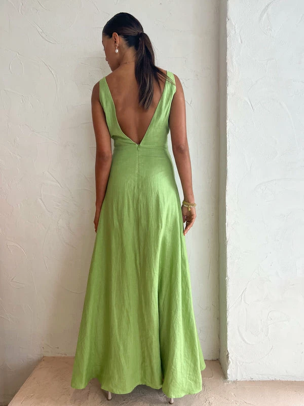 Refresh your Summer wardrobe with the crisp Apple hue of Issy Exclusive Blue Skies Dress. Designed for frolicking through warm summers day, this Linen midi dress dress flatters the décolletage with a V neckline and symmetrical backline, and a twist front bodice with a waist cut out before falling to a flounced maxi length circle skirt. Coco girls can't resist this maxi moment for wedding celebrations, long lunches and birthday festivities. DETAILS & CARE Fabric: Main: 100% Linen Lining: 100% Cotton – Twisted/Draped front bodice – Low v-shaped back neckline – Invisible zipper at the centre back- Fully lined – Maxi length circle skirt/flounced skirt COCO STYLING TIP Finish this special occasion look with the Camilla and Marc Vigo Heel in Ivory, Vieux Bayonne in Bone, Amber Sceats Valletta Earrings in Gold, Reliquia Telde Necklace in Gold, Amber Sceats Electra Ring Set in Gold, Amber Sceats Grande Helena Ring in Gold, Porter Triple Heirloom Ring in Gold and the Amber Sceats Hunter Bracelet in Gold.