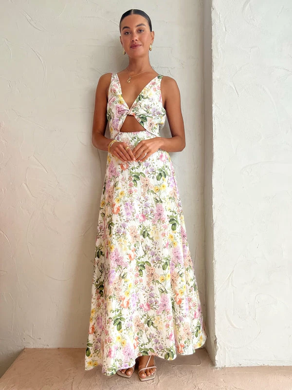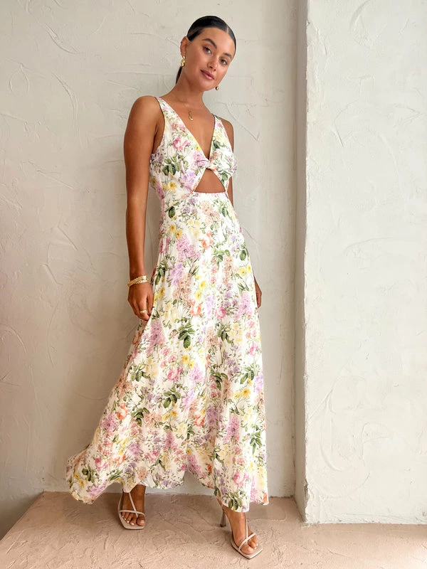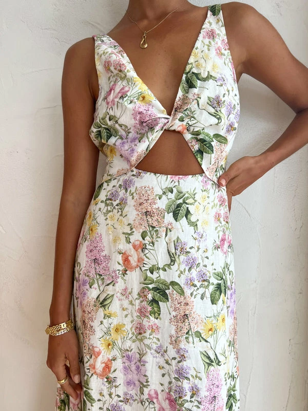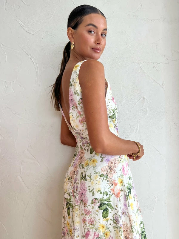 Enjoy a summer romance with the Coco & Lola Exclusive Blue Skies Dress in Spring from Issy. Crafted from Linen with a Cotton lining, this midi dress flatters the décolletage with a V neckline and symmetrical backline, and a twist front bodice with a waist cut out before falling to a flounced maxi length circle skirt. Cherished for its charming Spring bloom print, the Blue Skies Midi is perfect for your upcoming calendar occasions, Winery tours, birthday celebrations and wedding festivities. DETAILS & CARE Fabric: Main: 100% Linen Lining: 100% Cotton – Twisted/Draped front bodice – Low v-shaped back neckline – Invisible zipper at CB- Fully lined – Maxi length circle skirt/flounced skirt COCO STYLING TIP Finish this special occasion look with the Alias Mae Molly Heel in Cream, Amber Sceats Klein Earrings in Gold, Reliquia Telde Necklace in Gold, Amber Sceats Electra Ring Set in Gold, Porter Pond Ring in Gold and the Amber Sceats Hunter Bracelet in Gold and the Porter Chunky Belcher Bracelet in Gold.
