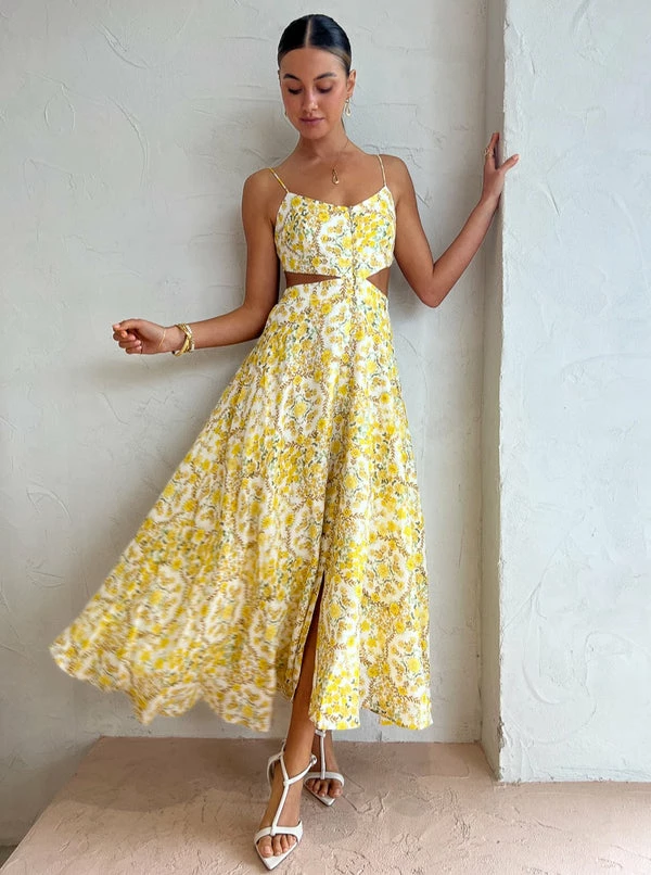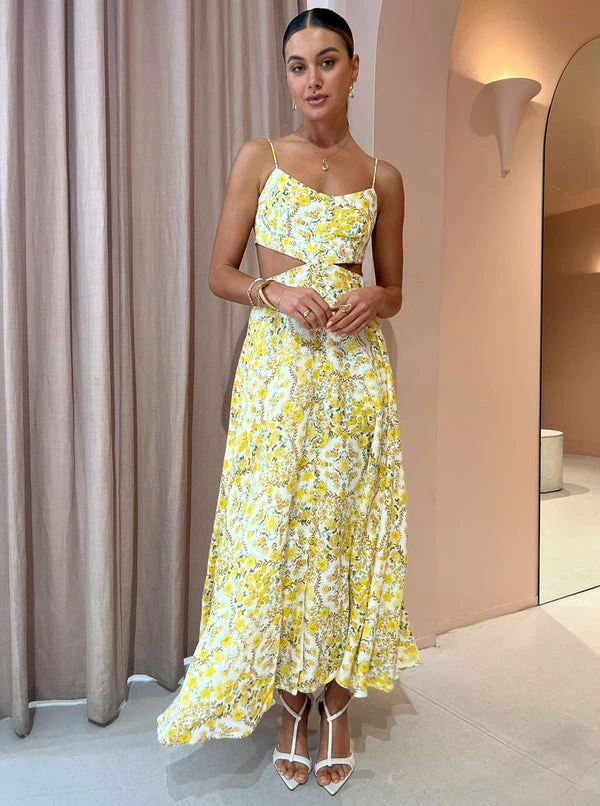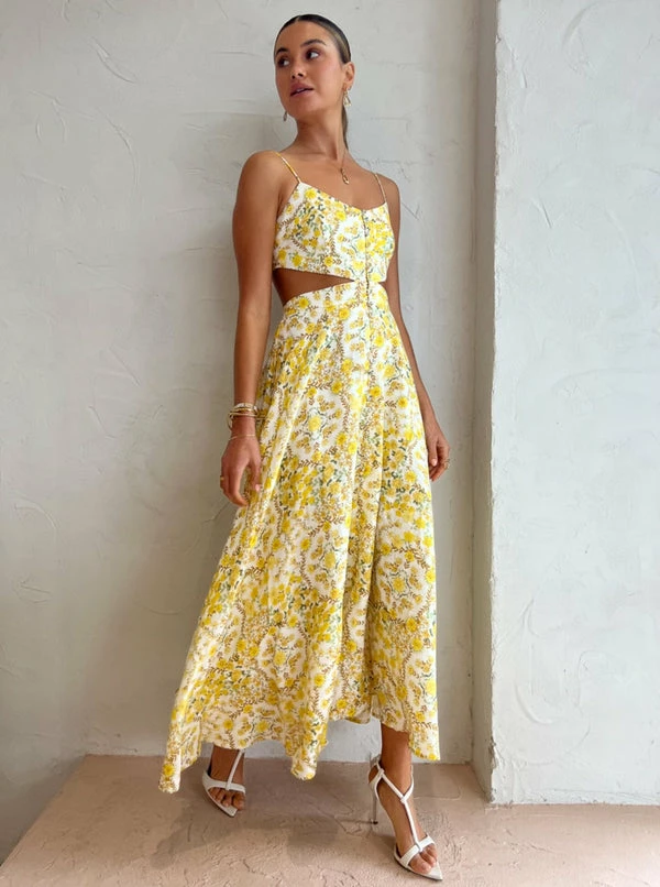 Celebrate sunshine season with the Coco & Lola Exclusive, the Duet Dress in Flower Crown by Issy. Crafted from a crisp Cotton fabrication, this flattering midi dress features a square neckline with wide straps and an elasticated ruched back before falling into a gathered maxi silhouette. Finished with alluring cuts outs on the side and back, make the most of the warmer months and twirl through special Coco moments. DETAILS & CARE Fabric: Main: 100% Linen Lining: 100% Cotton- Maxi Dress- Thin straps- Square neck- Cut out detailing on side and back- Tiered A line skirt – Centre back skirt zip closure Our Coco girl Eden wears a size 8 AU / small. Eden's height is 175cm. COCO STYLING TIP For special occasion styling, complete the look with the Camilla and Marc Vigo Heels in Ivory, Porter Harp Ring in Gold, Porter Wave Ring Set in Gold, Porter Frill Cuff in Gold, Amber Sceats Hunter Bracelet in Gold, Reliquia Telde Earrings in Gold, Porter Pond Bangle in Gold and the Reliquia Telde Necklace in Gold.