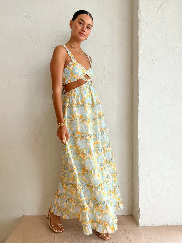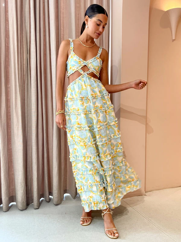 Celebrate life's special moments with the Coco & Lola Exclusive, the Felix Dress in Aloha by Issy. Crafted from a 100% Ramie fabrication, this flattering maxi dress features a ruffled maxi skirt with cutouts, ruffle strap detailing, and an adjustable bodice tie at back. Finished with a full skirt and statement cutouts, this maxi will be a show stopping piece to pair with all your garden party soirees, wedding celebrations and birthday events. DETAILS & CARE Fabric: Main: 100% Ramie Lining: 100% Cotton – Maxi dress – Cut outs – Ruffle strap detailing – Full/gathered skirt – Invisible zipper at side skirt – Adjustable bodice tie at back – Adjustable straps – Exclusive print Our Coco girl Eden wears a size 8 AU / small. Eden's height is 175cm. COCO STYLING TIP Finish the look with the Alohas Grace Heel in Corn Ivory, Vieux Bayonne in Bone, Amber Sceats Valletta Earrings in Gold, Arms of Eve Rae Chain Necklace in Gold, Porter Baby Link 2.0 Bracelet in Gold, Arms of Eve Eros Textured Ring in Gold, Amber Sceats Grande Helena Ring in Gold, Porter Triple Heirloom Ring in Gold and the Amber Sceats Coco Bracelet in Gold.