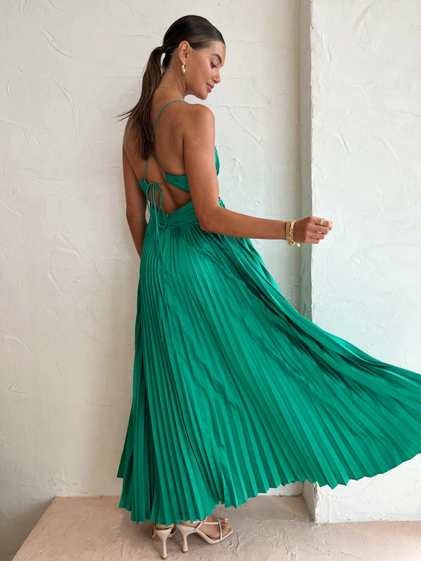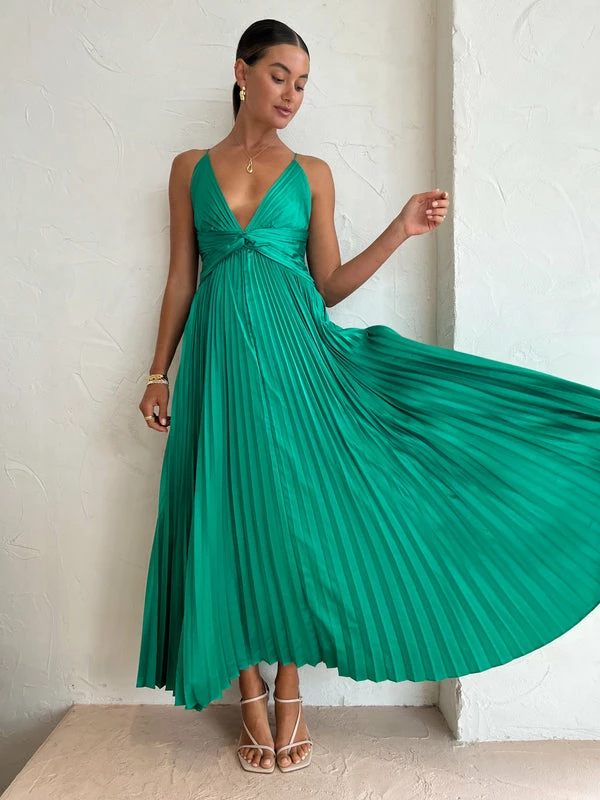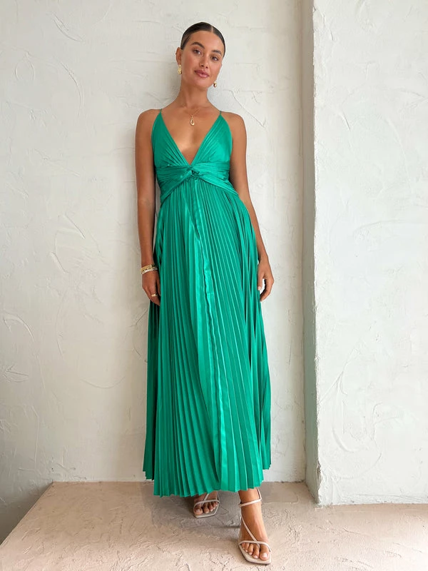 Our love affair with Issy continues with the Coco & Lola Exclusive Orla Dress in Jade. Returning in a ravishing Jade Green, this signature silken to touch pleated maxi dress flatters the femme form with a plunging V neckline, a twist waist detail and slim rouleau straps that self-tie and cross over at the back. Its awe inspiring pleated skirt creates romantic motion as Coco girls glide through wedding festivities, formal soirèes and black tie dress code occasions. DETAILS & CARE Fabric: 100% Polyester Satin Fabrication – Maxi length – V neckline – Slim rouleau straps – Twist detail tapered waistline – Pleated fabrication – A Line umbrella pleat skirt – Centre back skirt zip closure – Cross over self tie straps Our Coco girl Eden wears a size 8 AU / small. Eden's height is 175cm COCO STYLING TIP Finish this special occasion look with the Alias Mae Molly Heel in Cream, Amber Sceats Klein Earrings in Gold, Reliquia Telde Necklace in Gold, Amber Sceats Electra Ring Set in Gold, Porter Triple Heirloom Ring in Gold and the Amber Sceats Hunter Bracelet in Gold and the Porter Chunky Belcher Bracelet in Gold.