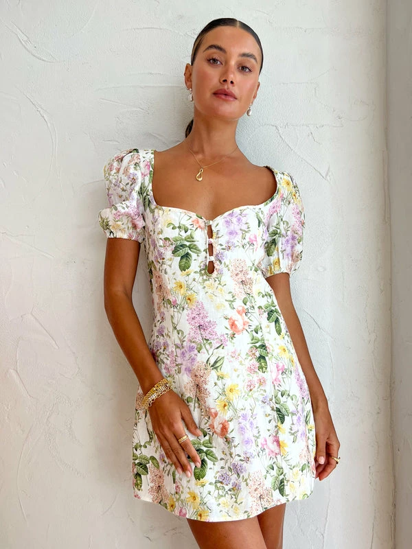 Spend your summer days twirling in the Coco Exclusive Promenade Dress in Spring from Issy. Delicately crafted from a crisp linen fabrication with a spring-inspired print, this mini dress features a low square neckline with a keyhole and elasticated puff sleeves. Adored for its sweet silhouette and enchanting print, Coco girls can't wait to twirl through their up-and-coming wedding festivities, romantic date nights and ladies' lunches. DETAILS & CARE Fabric: Main: 100% Linen Lining: 100% Cotton – Mini dress – Low square neckline with keyhole and covered button details – Puff short sleeves with elasticated cuff – Invisible zipper at the side seam – Exclusive print Our Coco girl Eden wears a size 8 AU / small. Eden's height is 175cm. COCO STYLING TIP Finish this special occasion look with the Aloha's Twist Strap Heel in Camel, Vieux Bayonne in Bone, Amber Sceats Valletta Earrings in Gold, Reliquia Telde Necklace in Gold, Amber Sceats Electra Ring Set in Gold, Porter Pond Ring in Gold, Porter Triple Heirloom Ring in Gold and the Amber Sceats Hunter Bracelet in Gold.