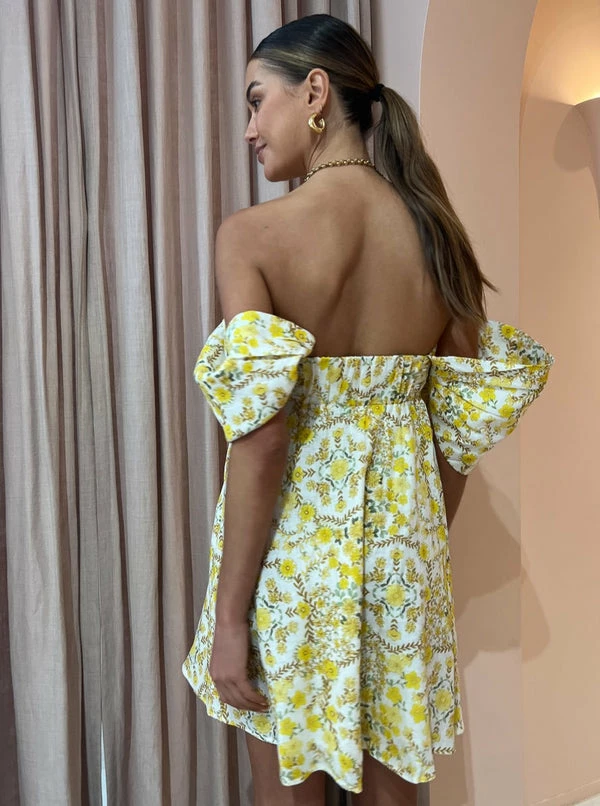 Exclusive to Coco & Lola, the Issy Teacups Dress in Flower Crown is your summer mini must-have for your Coco wardrobe. Crafted from a crisp Linen fabrication, this sweet babydoll silhouette features a square neckline, button detailing down the centre front and puff sleeves that can be styled on or off the shoulder. Falling into a soft mini skirt, this mini dress is perfect for floating through garden party soirees, romantic date nights and into weekend getaways. DETAILS & CARE Fabric: Main: 100% Linen Lining: 100% Cotton- Babydoll silhouette- Puff sleeves- Button down detail centre front- Square neck- Pin tuck at shoulder – Tiered A line skirt – Centre back skirt zip closure Our Coco girl Eden wears a size 8 AU / small. Eden's height is 175cm. COCO STYLING TIP For special occasion styling, complete the look with the Alias Mae Ari Heels in Cream, Porter Chunky Belcher Necklace 2.0 in Gold, Porter Heirloom Bangle 6mm in Gold, Porter Wave Ring Set in Gold, Porter Chunky Belcher Bracelet in Gold, Reliquia Trending Upwards Hoops in Gold and the Porter Pond Bangle in Gold.