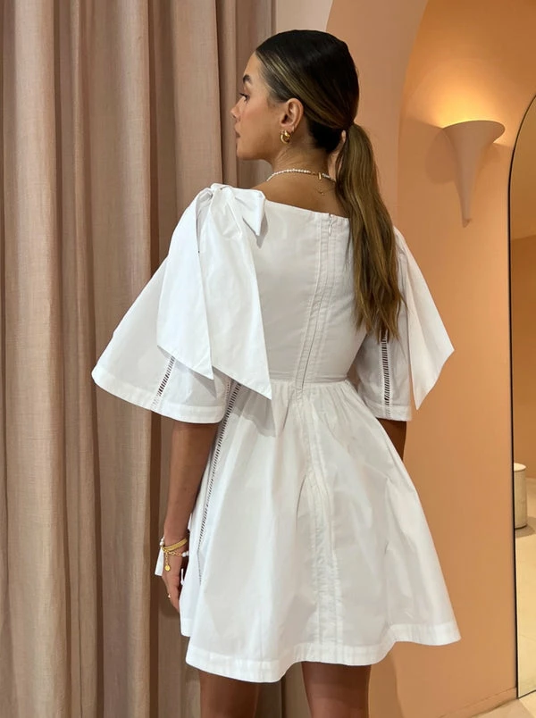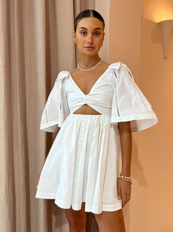 Luxury awaits your wardrobe with Joslin's Hollie Organic Cotton Mini Dress in Optical White. Carefully crafted from a crisp organic cotton poplin in White. This sweet mini dress highlights the décolletage with a low wide neckline, detailed with a knot design and cut out below bust. Featuring mid length sleeves with bow details and a fitted waistline before falling into a gently gathered skirt. Finished with signature lace ladder inserts and fabric covered button details, the Hollie Mini is a timeless investment for everyday wanderings and celebrating life's special moments. DETAILS & CARE Fabric: Main: Organic Cotton Poplin Trim: Cotton Ladder Lace Lining:Viscose Voile - Low and wide neckline with knot design detail – Cut-out below the bust – Elasticated waist – Bow detail at high shoulder – Kimino style sleeves with ladder lace inserts – Fabric covered button at centre front – Fully lined – A line mini skirt with gentle gathers Our Coco girl Eden wears a size 8 AU / small. Eden's height is 175cm. COCO STYLING TIP Complete the look with the Alias Mae Camelia Heel in Bone, the Amber Sceats Lars Bracelet in Gold, the Porter Frill Cuff in Gold, the Porter Wave Croissant Ring in Gold, the Porter Tear Drop Huggies in Gold and finish with the Reliquia Baby Coralia Earrings in Gold.