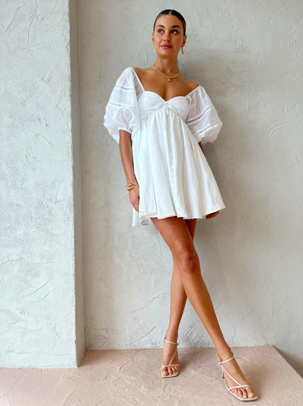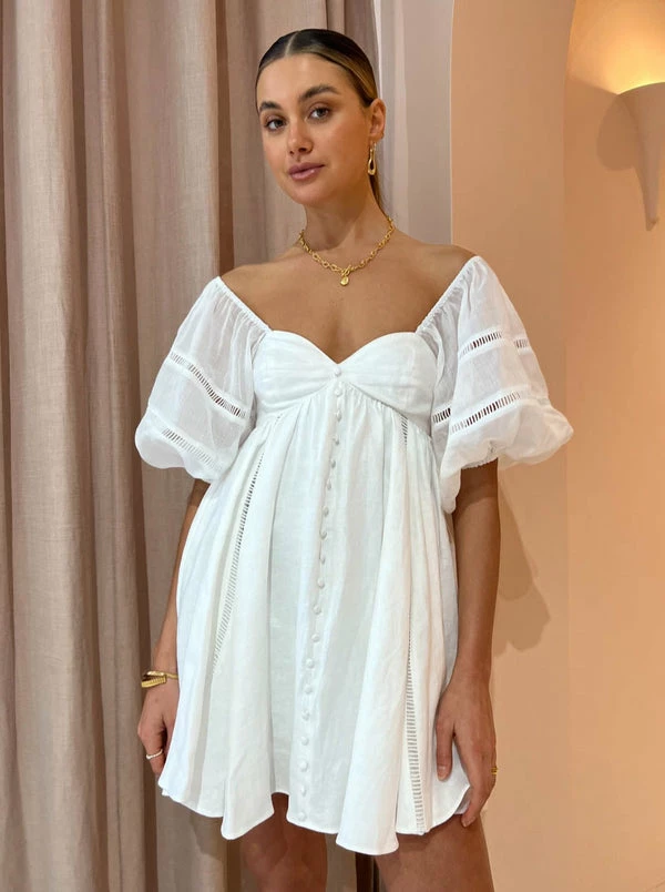 Look and feel endlessly sweet in Joslin's Ingrid Linen Ramie Mini Dress in Optical White. Delicately crafted from a mid weight linen fabrication that has an incredibly soft hand feel. Designed in a baby doll silhouette, this mini features a sweetheart neckline, voluminous elasticated sleeves that can be worn on or off the shoulder before falling gracefully into a full skirt. Signature to the brand's vintage aesthetic, it's finished with a centre front button and lace ladder detail. it's the perfect silhouette for beach to bar dressing. DETAILS & CARE Fabric: – Baby doll style mini dress- Bust cup panelling – Fabric covered buttons down centre front- Voluminous sleeves with elastic casing through the sleeve head and sleeve hem- Cotton Ladder lace inserts throughout the sleeve- Fully lined bodyOur Coco girl Eden wears a size 8 AU / small. Eden's height is 175cm. COCO STYLING TIP For signature Coco girl styling complete with the Alias Mae Molly Heel in Cream, Amber Sceats Coco Necklace and Bracelet in Gold, Reliquia Sevilla Earrings in Gold and the Porter Heirloom Bangle in Gold.