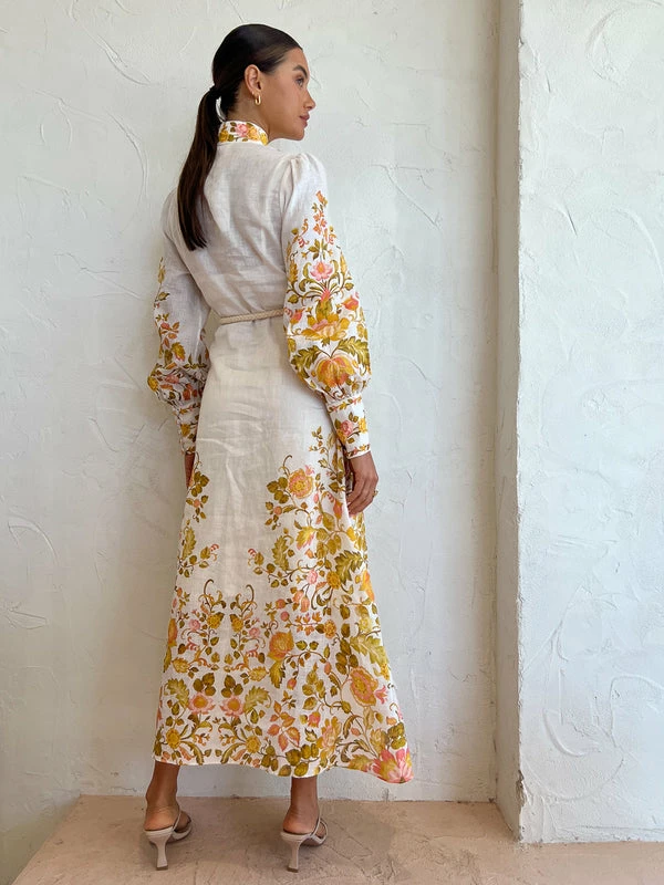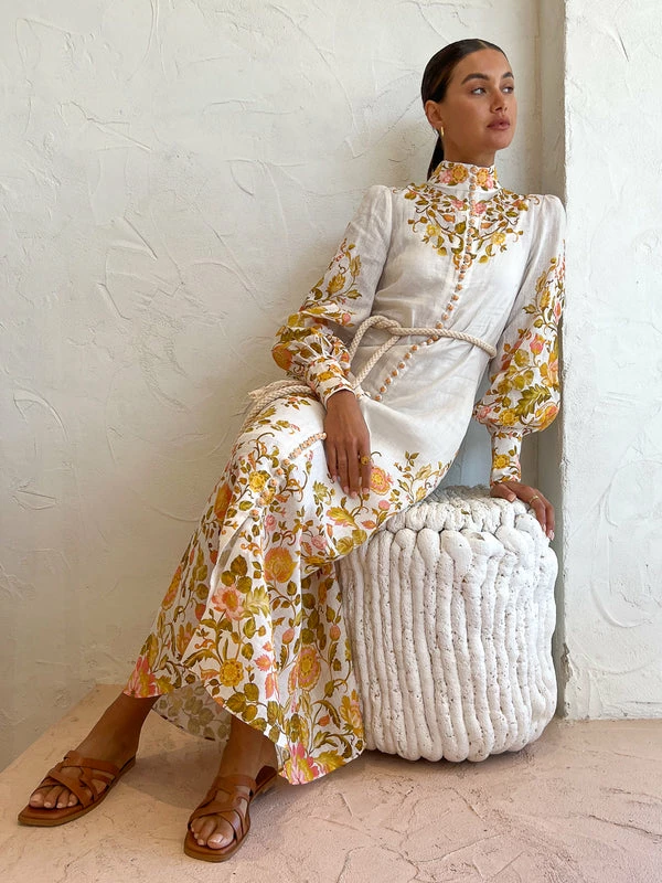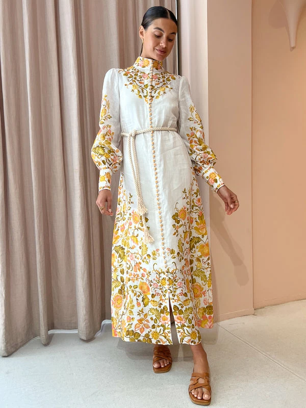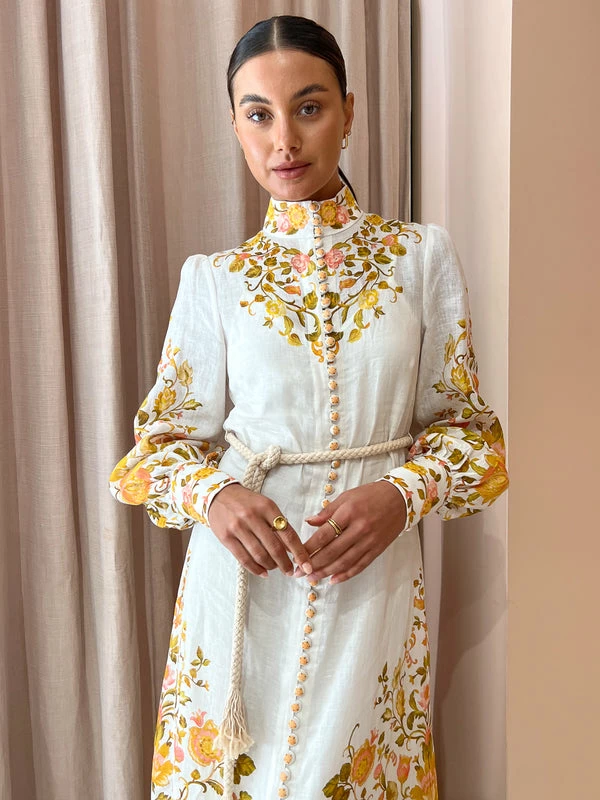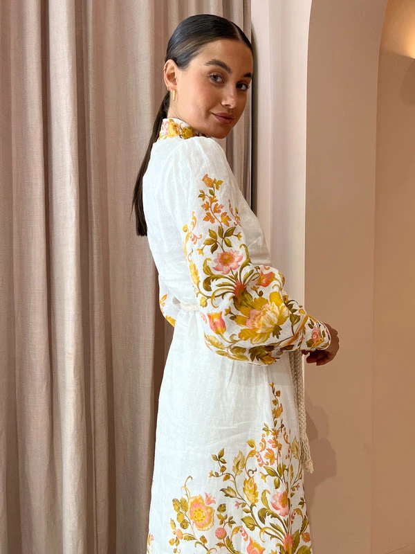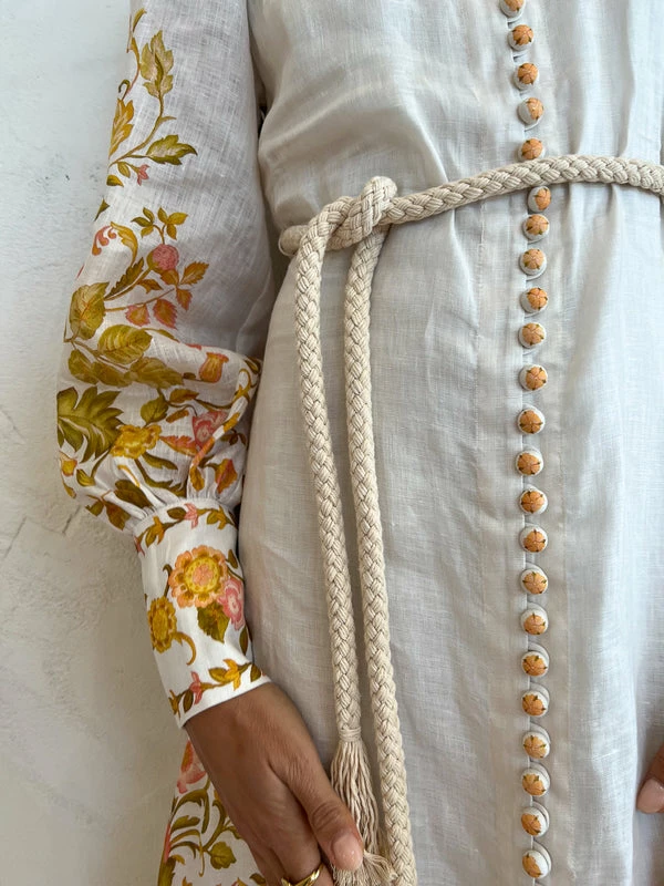 The Noaea Button Dress in Multi from Kate Ford fuses modern bohemia into your Coco closet.Crafted from a lightweight linen fabrication, this effortlessly sophisitiated midi dress features a high neckline, placement printed florals, delicate buttons and a detachable hand-weaved rope belt to cinch and flatter. With the elevated and flattering silhouette, Coco girls are coveting this midi dress for weddings, festive celebrations and birthday occasions. DETAILS & CARE Fabric: 100% Linen- Placement printed design- Placement printed buttons- Long puff sleeves- Hand-weaved rope belt- Ivory slip dress (sold with garment)Our Coco girl Eden wears a size AU 8 / small.Eden’s height is 175cm. COCO STYLING TIP Complete the look with the Alohas Pad Sandal in Tan, Arms of Eve Farrah Link Earrings in Gold, Amber Sceats Hunter bracelet in Gold, Porter Wave Ring Set in Gold, Porter Pond Ring in Gold.