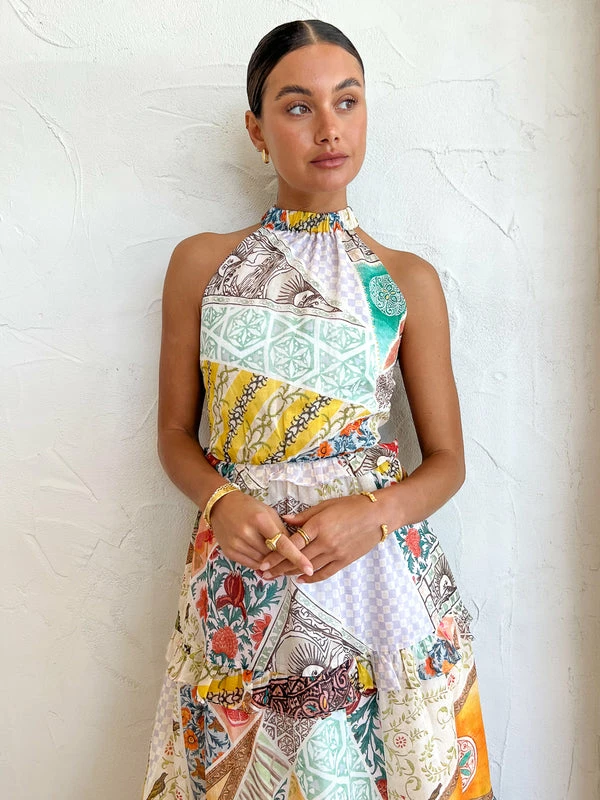 The Zellejie Long Layered Dress in Multi from Kate Ford is the luxe Boheme dress your celebration occasions have been waiting for. Crafted from a lightweight Ramie fabrication, this flattering maxi dress features a high elastic neckline, elasticated back opening and waist and a long tiered frilled skirt with a gathered bodice.With the conversation-starting patchwork print, Coco Girls are coveting this maxi dress for wedding celebrations, birthday occasions and long lunches. DETAILS & CARE Fabric: Main: 100% Ramie Lining: 100% Cotton Voile – Maxi dress – High elastic neckline- Elasticated back opening- Long tiered skirt- Frilled detailing- Gathered bodicePlease Note: All garments are uniquely made, meaning each print placement will look different to the images shown.Our Coco girl Eden wears a size AU 8 / small.Eden’s height is 175cm. COCO STYLING TIP Complete the look with the Alohas Pad Sandal in Tan, Arms of Eve Farrah Link Earrings in Gold, Amber Sceats Hunter bracelet in Gold, Porter Wave Ring Set in Gold, Porter Pond Ring in Gold.