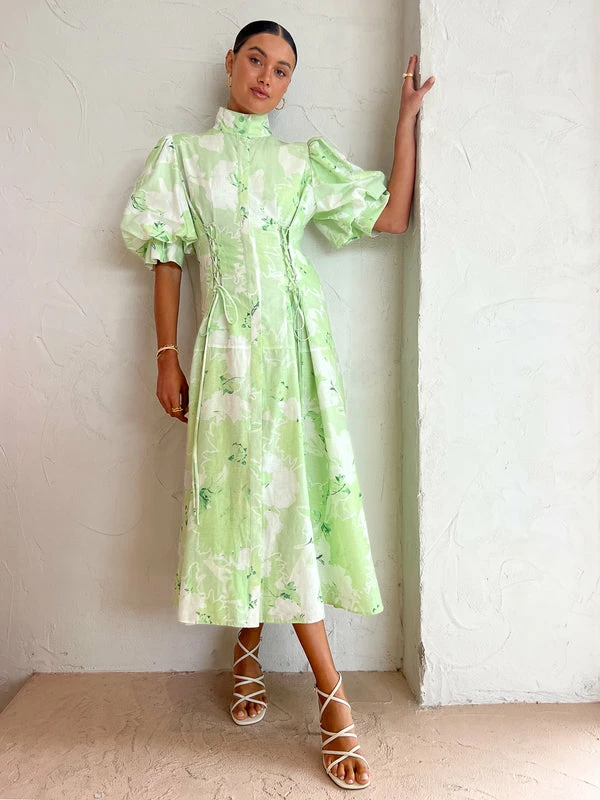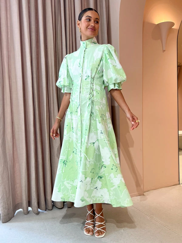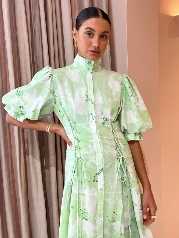 Embrace innocence and simplicity with the Anneke Midi Dress in Jasmine Print Sage by Leo Lin. Crafted from a soft cotton blend, this relaxed midi dress features a high collared neckline, short puffed sleeves, adjustable lace-up waist ties and a centre-back adjustable tie. Flaring into a voluminous skirt, this relaxed midi dress is perfect for wedding celebrations, garden parties and cocktail events. DETAILS & CARE Fabric: Main: 30% Cotton 70% Ramie Lining: 100% Cotton- Premium cotton blend midi dress- Exclusive LEO LIN Jasmine Print in Sage- High-collared neckline- Concealed front button tab- Short puffed sleeves- Adjustable lace-up waist ties- Centre back adjustable tie- Flared voluminous skirt- Full lining- Relaxed silhouetteCare Instructions: Dry Clean Only. Due to the delicate nature of the fabric, please take extra care when wearing & handlingOur Coco girl Eden wears a size AU 8 / small.Eden’s height is 175cm. COCO STYLING TIP Finish the look with the Alias Mae Lin Heel in Cream, Amber Sceats Lane Ring in Gold, Amber Sceats Grande Helena Ring in Gold, Porter Chunky Belcher Bracelet in Gold and the Bella Sceats Bella Earrings in Gold.