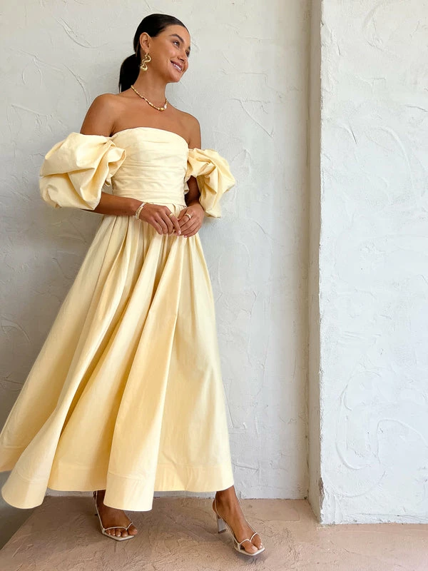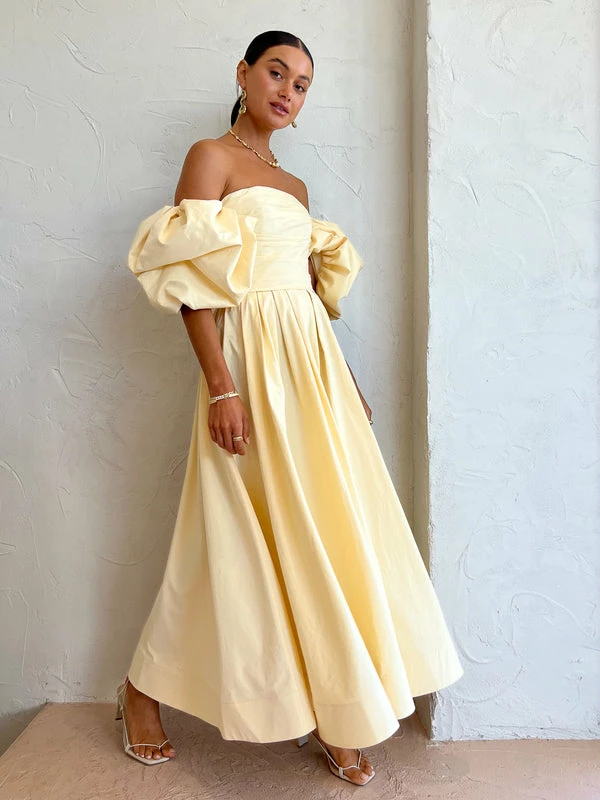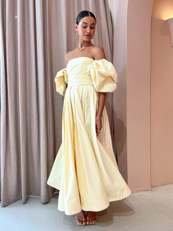 Exude effortless confidence with the Matilda Puff Sleeve Midi Dress in Lemon by Leo Lin. Crafted from a soft cotton fabrication, this midi dress features a strapless straight neckline, puffed short sleeve and a hand-draped bodice.Falling to a gathered voluminous midi skirt, Coco girls are coveting this midi for garden parties, summer soireès and wedding celebrations. DETAILS & CARE Fabric: Main: 100% Cotton Lining: 100% Cotton- Premium cotton midi dress- Straight strapless neckline- Puffed short sleeves- Hand-draped bodice- Gathered voluminous midi skirt- Side pockets- Structured crinoline hem- Invisible back zip closure- This dress is a fitted styleCare Instructions: Dry Clean Only. Due to the delicate nature of the fabric, please take extra care when wearing & handlingOur Coco girl Eden wears a size AU 8 / small.Eden's height is 175cm. COCO STYLING TIP Finish the look with the Aloha Grace Heel in Corn Ivory, Amber Sceats Electra Ring Set in Gold, By Charlotte Dream Weaver Cuff in Gold, Amber Sceats Hunter Bracelet in Gold, Alohas Grace Heel in Ivory, Amber Sceats Brinkley Necklace in Gold and the Alemais Infinity Earrings in Gold.
