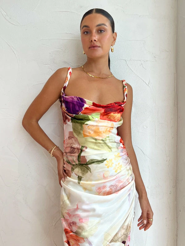 Signature styles meet a renewed focus on floral prints with the Rachel Cowl Neck Slip Dress in Cascade Print by Leo Lin. Crafted from a pure silk fabrication, this fitted slip dress features a cowl neckline, braided straps, side skirt splits and a ruched bodice. Adored for its artistic details and original print, Coco girls adore this silhouette for weddings, cocktail hour and summer getaways. DETAILS & CARE Fabric: 100% Silk- Premium silk midi dress- Exclusive LEO LIN Cascade Print- Braided straps- Cowl neckline- Ruched bodice- Invisible side zip closure- Side skirt splits- Fitted silhouetteCare Instructions: Dry Clean Only. Due to the delicate nature of the fabric, please take extra care when wearing & handlingOur Coco girl Eden wears a size AU 8 / small.Eden’s height is 175cm. COCO STYLING TIP Finish the look with the Alias Mae Lin Heel in Cream, Amber Sceats Electra Ring Set in Gold, By Charlotte Dream Weaver Cuff in Gold, By Charlotte Align Your Soul Ring in Gold, Porter Triple Heirloom Ring in Gold, Porter Hailey Twist Necklace in Gold and the Amber Sceats Klein Earrings in Gold.