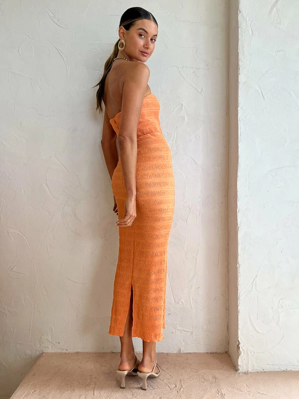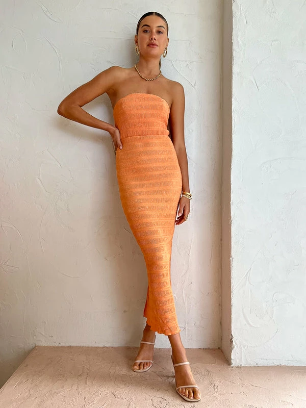 Shimmer through Apéritivo hour in the coveted L'IDÉE WOMAN Aurore Gown in Sunset. Crafted from signature smocking pleat fabrication in Sunset, this stunning strapless midi is an easy to wear silhouette. Sitting fitted at the bodice to flatter and gently fluted at the hem to the female form effortlessly. Coco girls can't resist the Aurore for cocktail occasions, birthday celebrations and wedding festivities. DETAILS & CARE Fabric: Main 100% high grade pleated polyester – Midi length design – Fitted bodice (no elastic) – Elasticated from the bottom of the bodice – Zip closure along back – Strapless neckline Our Coco girl Eden wears a size AU 8 / small.Eden’s height is 175cm. COCO STYLING TIP For your next formal occasion, compliment this moment of glamour with the Alias Mae Zi Heel in Cream, the Reliquia Over and Over Earrings in Gold, the Porter Chunky Belcher Bracelet in Gold and Porter Pond Ring in Gold.