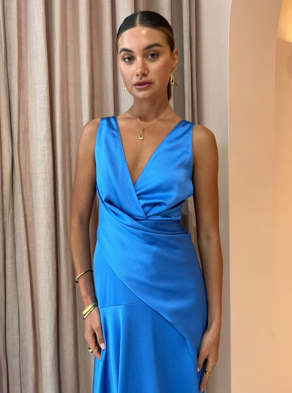 The Alegra Midi in Ultramarine from One Fell Swoop is a show stopping silhouette for celebration season styling. Crafted from a mid-weight textured satin fabrication, this maxi dress features a V-neckline with thick straps that wrap diagonally across the waistline from the left bust to the right hip and the back is cut away with an adjustable ruched tie before falling into a fluid wrap skirt with split. With an unexpected exposed back, we adore this statement midi dress for formal soirees, wedding celebrations and romantic twilight occasions. DETAILS & CARE Fabric: Main 100% Polyester – Deep V-neckline with thick straps – Adjustable ruched back with tie – Cross bodice drape detailing – Fluid skirt with wrap detail that falls into a slight split – Invisible zip closure a rear seam – Bra appropriate – Satin textured fabrication, medium weight, non-sheer, non-stretch – Unlined, slight bubble texture Care Instructions: Cool gentle wash, separately. Our Coco girl Eden wears a size AU 8 / small.Eden’s height is 175cm. COCO STYLING TIP Complete this look with the Camilla and Marc Vigo Heel in Ivory, Reliquia Telde Necklace in Gold, Reliquia Telde Earrings in Gold, Porter Wave Ring Set in Gold, Porter Celestial Ring, Porter Pond Bangle in Gold and the Arms of Eve Helios Cuff Bracelet in Gold.