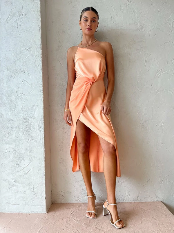 Distinctly One Fell Swoop, the Aria Dress in Persimmon add's a sweet fruitiness to our occasion wardrobe. Delicately crafted from a dual textured fabrication, with one matte and one shine, this midi is flawlessly draped to compliment the curve of the figure. Designed with an asymmetrical neckline with two thin straps that run from the left, it feature a twist detail across the waistline that drapes fluidly with the length of the silhouette. Falling to a mid calf length, the centre front is cut with a split to create an asymmetrical hemline allowing you to move with ease through cocktail parties, birthday celebrations and formal soirees. DETAILS & CARE Fabric: 100% Polyester – Midi-length skirt – One shoulder neckline – Slim straps – Cinched waist – Close fit bodice – Central overturn twist; dual finish, one matte one shine – Subtle asymmetrical hemline – Left baring split from mid-thigh – Invisible zip centre back – Medium-lightweight fabrication – Fluid, slinky drape – Smooth high shine finish, natural give Our Coco girl Eden wears a size 8 AU / small. Eden's Height is 175cm COCO STYLING TIP For signature Coco glamour, complete with the Alias Mae Camelia Heel in Bone, the Reliquia Trending Upwards Hoops in Gold, the Porter Chunky Necklace in Gold, Amber Sceats Hudson Bracelet in Gold, Porter Celestial Bracelet in Gold.