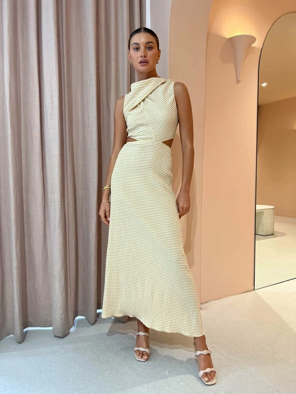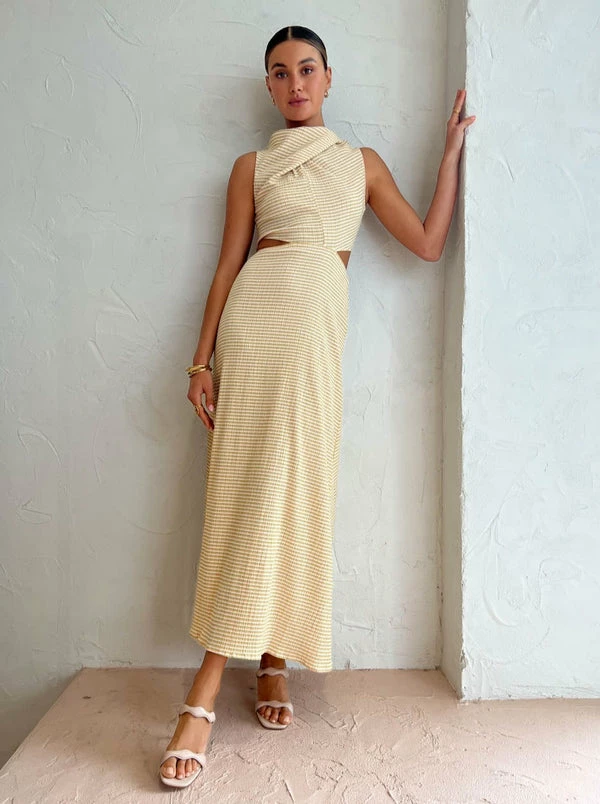 The signature One Fell Swoop silhouette has returned with the Bijoux Maxi Dress in Calipo.A timeless and elegant maxi length silhouette, this sleeveless maxi dress is cut from a mid-weight fabrication and features a high neckline complimented with structured draping across the chest and gentle asymmetric cut outs at the waist.With the flattering silhouette, Coco Girls are coveting this must-have maxi dress for wedding celebrations through to black tie occasions. DETAILS & CARE Fabric: 90% Polyester 10% Viscose- Lightweight fabrication with shirred texture- Slip into style; this style is free from zips of fastenings.- Textured stretch fabric, non-sheer, un-lined- Crossover drape detail at the bust- Covered back- Cut-out detail at rib and lower back- A-line skirt- Maxi lengthCare Instructions: Cold Gentle Hand Wash with Neutral Detergent, Dry Clean With CareOur Coco Girl Eden wears a Size AU 8 / SmallEden's Height is 175cm COCO STYLING TIP Complete the look with the Alias Mae Lin Heels in Cream, Porter Harp Ring in Gold, Porter Pond Bangle in Gold, Porter Frill Cuff in Gold, Porter Heirloom Bangle 6mm in Gold, Porter Wave Ring Set in Gold, Porter Mali Hoops in Gold and the Porter Chunky Belcher Necklace 2.0 in Gold.