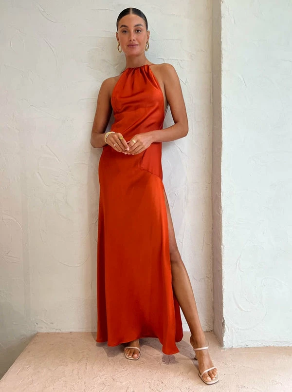 Enhance life's special moments with the luxurious Capricorn Dress in Burnt Orange by One Fell Swoop. Crafted from a light-medium weight fabrication with a subtle shine finish, this effortlessly chic maxi dress slips on with ease and features a high neckline with box pleating detail, a low cut back and is finished with a bias cut maxi length skirt with a thigh-high split.Adored for its statement-making exposed back and thigh-high split, this maxi dress will turn heads at any special occasion in your event calendar. DETAILS & CARE Fabric: 100% Polyester- Slip into style; zipless- High neckline with box pleating detail- Stunning exposed back with thin straps – Tailored seams to waist- Bias cut maxi length skirt with split thigh high- Suitable for an adhesive bra- Bias-cut shape- Slim fit body flowing to A-line maxi skirt- Light-medium weight fabrication with a subtle shine- Natural giveCare Instructions: Cold Gentle Hand Wash with Neutral Detergent, Low Spin. Dry cleanable. Our Coco Girl Eden wears a Size AU 8 / SmallEden's Height is 175cm COCO STYLING TIP Finish the look with the Alias Mae Zi Heels in Cream, Reliquia Over and Over Earrings in Gold, Amber Sceats Hunter Bracelet in Gold, Porter Chunky Belcher Bracelet in Gold, Porter Triple Heirloom Ring in Gold, Amber Sceats Electra Ring Set in Gold and the Porter Pond Ring in Gold.