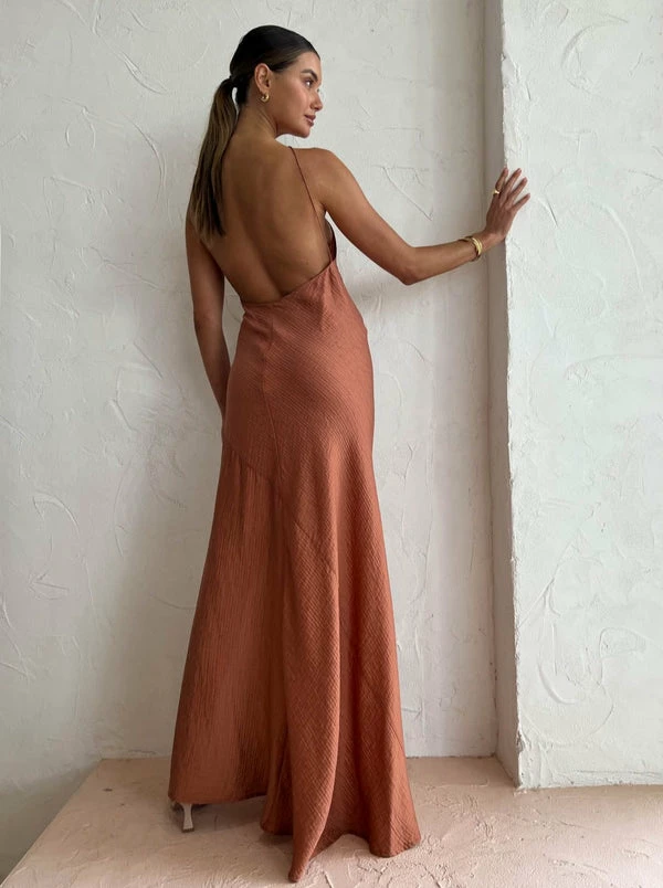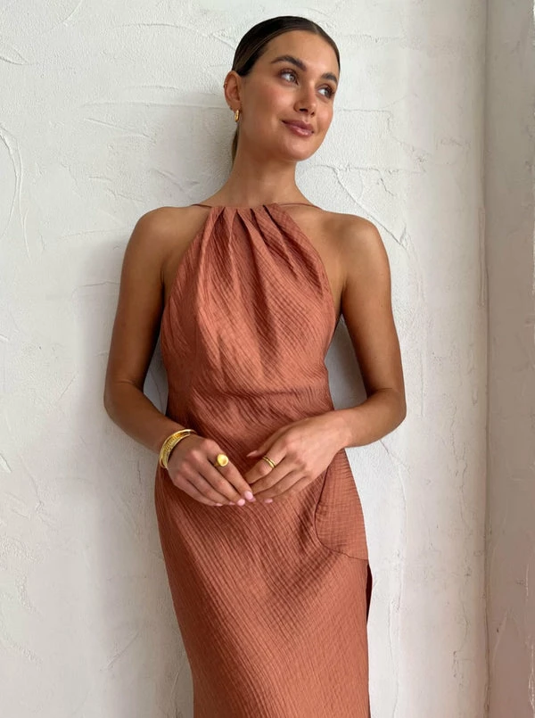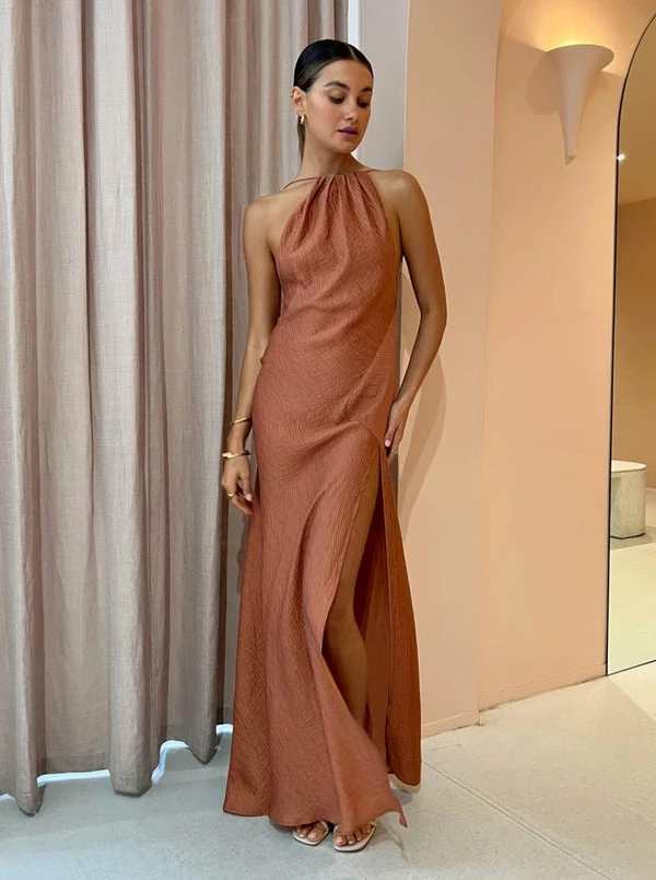The Capricorn Dress in Chestnut from One Fell Swoop is a sophisticated maxi moment invigorated with a bold thigh high side split.Crafted from a mid-weight fabrication with a sand wash finish, this effortlessly chic maxi dress slips on with ease and features a high neckline with box pleating detail, a low cut back and is finished with a bias cut maxi length skirt with thigh high split. With the statement-making exposed back, this maxi dress will turn heads at any special occasion in your event calendar. DETAILS & CARE Fabric: 45% Rayon 37% Tencel 18% Nylon- Medium to light weight damask with contrast satin strokes- Slip into style; this style is free from zips or fastenings.- High neckline with box pleating detail- Stunning exposed back with thin straps- Tailored panel to hipline- Bias cut maxi length skirt with thigh high split- Suitable for adhesive bra- Slim fit bias cut body flowing to A-line maxi skirtCare Instructions: Cold Gentle Hand Wash with Neutral Detergent, Dry Clean With CarePlease Note: The vintage finish on this garment gives a soft, chamois-like feel and lustre. The occasional variations are no way tobe considered a flaw; it is characteristic of the treatment and gives this fabric its unique handle and beauty.Our Coco Girl Eden wears a Size AU 8 / SmallEden's Height is 175cm COCO STYLING TIP Style with the Alias Mae Zi Heels in Cream, Porter Heirloom Bangle 6mm in Gold, Porter Pond Bangle in Gold, Porter Frill Cuff in Gold, Porter Pond Ring in Gold, Porter Paris Huggies, Porter Wave Ring Set in Gold and the Porter Baby Celestial Necklace in Gold.