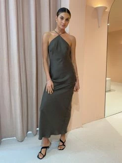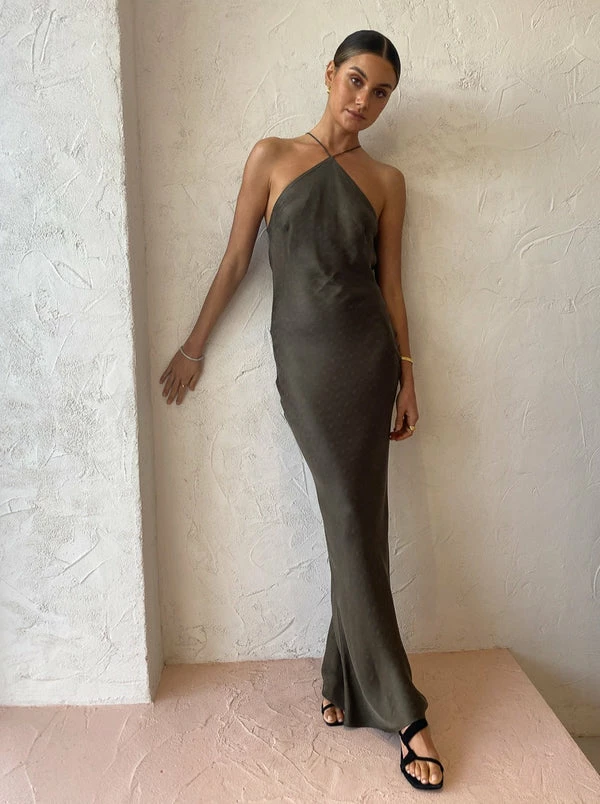Slip into endless elegance with the Coco Exclusive Chloe Dress in Lotus Suede by One Fell Swoop. Crafted from a Cupro blend fabrication, this bias cut maxi dress features a halter neckline with thin adjustable straps, and a captivating low cut back with symmetrical panelling detail.Finishing at an elegant ankle grazing maxi length, the Chloe dress is finished in a dimensional jacquard embodied fabrication for your special Coco moments. DETAILS & CARE Fabric: 70% Cupro 30% Viscose- Bias cut slip- Fine halter neckline- Fixed bound shoestring strap around neckline- Adjustable straps at back – Low cut back, symmetrical panels with pleating detail- Ankle length skirt with straight hemlineCare Instructions: Gentle cool hand wash, do not bleach or wring, do not tumble dry, dry flat warm iron on reverse side, dry clean with care.Our Coco girl Eden wears a Size 8 AU / Small.Eden's Height is 175cm. COCO STYLING TIP Finish with Mara & Mine Delfine Heel in Black, Porter Harp Earrings in Gold, Porter Frill Cuff, Porter Celestial Bracelet in Sterling and Porter Bubble Ring in Gold.