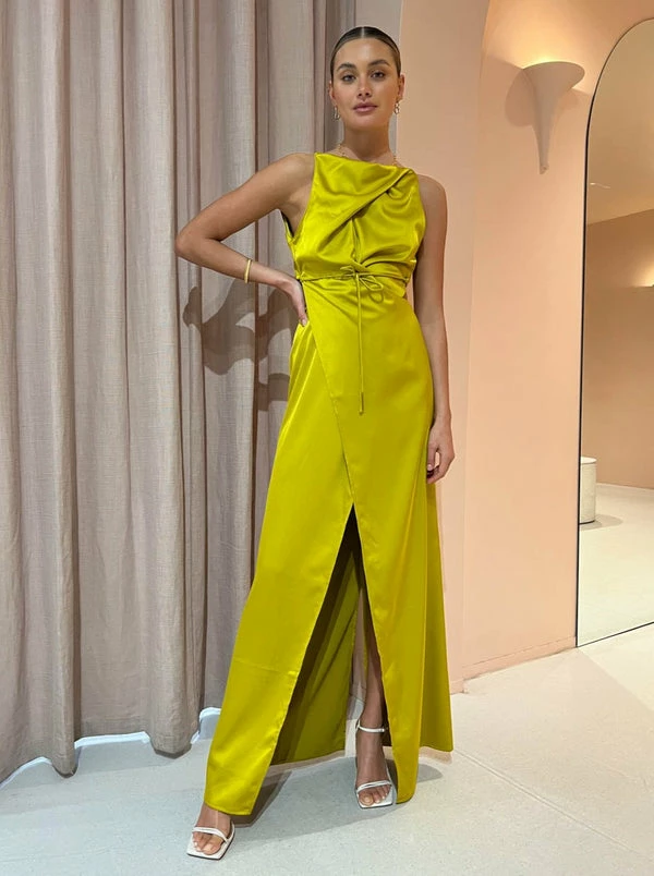 The Coco Exclusive Cult Maxi in Citrien by One Fell Swoop is a modern take on your classic wrap silhouette. Crafted from a luxurious silken to touch fabrication, this maxi dress wraps around the body in a draped precision to flawlessly fit to the figure in all the right places. Featuring a cross over drape neckline, wrap style midi skirt with centre split and unexpected back cutout. Turning heads with its wrap style back detail, the Cult Maxi is finished in a vibrant Citrien for golden hour Coco occasion. DETAILS & CARE Fabric: 100% Polyester- Wrap style silhouette- Crossover drape detail at the bust- Symmetrical wrap feature at back with ties- Cut out at the bottom rib- Fitted waistline- Central split- Invisible zip closure- Maxi lengthOur Coco girl Boston wears a Size 8 AU / Small.Boston's Height is 178cm COCO STYLING TIP Finish with the Alias me Camelia Heel in Bone, the Porter Frill Cuff in Gold, Porter 90s Hoops 30mm in Gold and Amber Sceats Hudson Bracelet in Gold for your next romantic Coco moment.