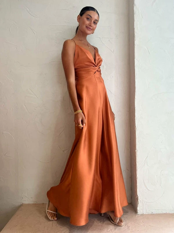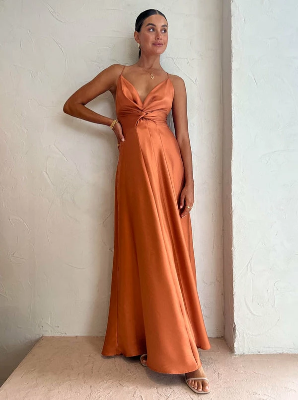 Celebrate life's special moments with season-less silhouettes in the Emmeline Maxi Dress in Sienna by One Fell Swoop.Crafted from a medium to light satin twill fabrication, this maxi dress features a plunging neckline and complimentary twist detailing before falling into a voluminous maxi skirt.With the panelled racer-back styling, Coco Girls love this playful yet timeless maxi dress for birthday celebrations, date nights and twilight cocktails. DETAILS & CARE Fabric: 69% Polyester 31% Cotton- Deep V-Neckline with thin rouleau straps- Micro interlocking, twist feature tailored to the waistline under the bust- Panelled racer-style back- Maxi-length skirt- Fluid Skirt with subtle fluting straight hemline- Invisible zip to right side seam- Adhesive bra appropriate- Medium to lightweight satin twill with diagonal weave- Structured fit, luxuriant handleOur Coco Girl Eden wears a Size AU 8 / SmallEden's Height is 175cm COCO STYLING TIP Complete this glamorous look with the Alias Mae Molly Heel in Cream, Amber Sceats Grande Helena Ring in Gold, Amber Sceats Diana Ring in Gold, Arms of Eve Eros Textured Ring in Gold, Reliquia Telde Necklace in Gold, Reliquia Coralia Hoops in Gold, Porter Baby Link 2.0 Bracelet in Gold and the Amber Sceats Coco Bracelet in Gold.